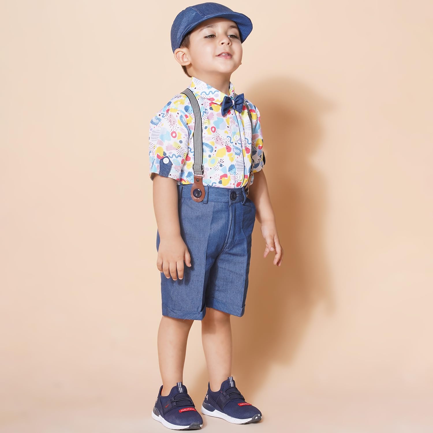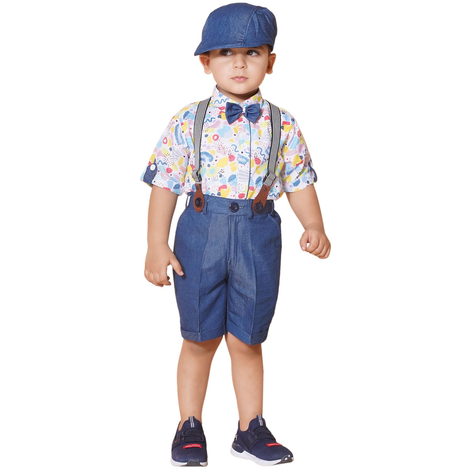- Features – Printed Shirt has Front Button Closure, Half Sleeve, Spread Collar with Shorts Matching Bow, Shorts Has Solid Pattern and Patial Elastic Waistband, Button & Zipper Closure, Have Two Pocket. Suspender Features – Matching Suspender, Strip Pattern, Elasticated. Cap matching with shorts.