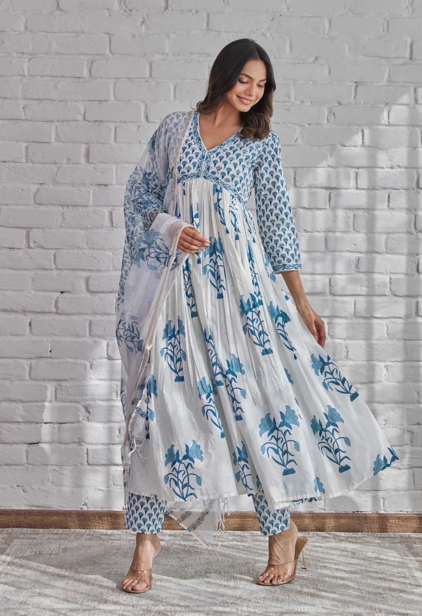 ANNI DESIGNER Women’s Rayon Blend Printed Anarkali Kurta with Pant & Dupatta (Betul White_L_White_Large)