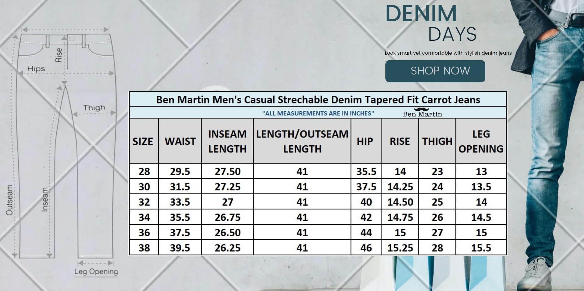 - (Higher Rise): This Ben Martin Stylish & Stretchable carrot fit jeans often have a higher rise, meaning it’s sit higher on the waist compared to other styles like low-rise or mid-rise men jeans pant.