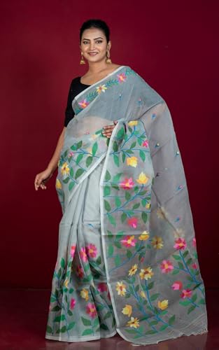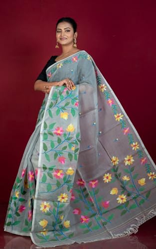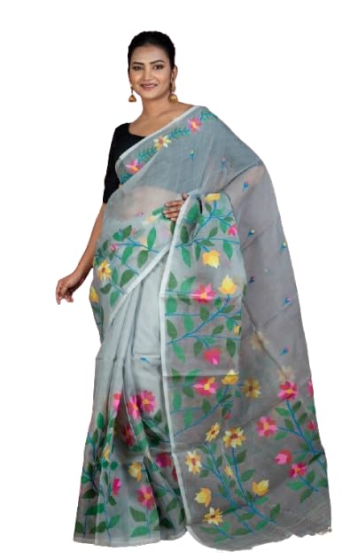 Bengal Looms India – Dhakai Jamdani Muslin Silk Saree – Handwoven Floral Skirt with Nakshi & Minakari Thread Work – Traditional Lightweight Saree for Women (Grey & Multicolored)