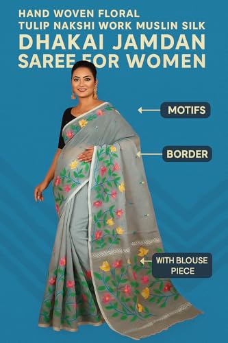 - Authentic Dhakai Jamdani Weave: Handwoven muslin silk saree featuring traditional floral skirt-style patterns and Nakshi work for an elegant ethnic look.