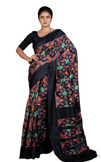Bengal looms India Exclusive Madathasu Ikkat Pochampally Silk Saree in Black, Red and Multicolored Sari for Women