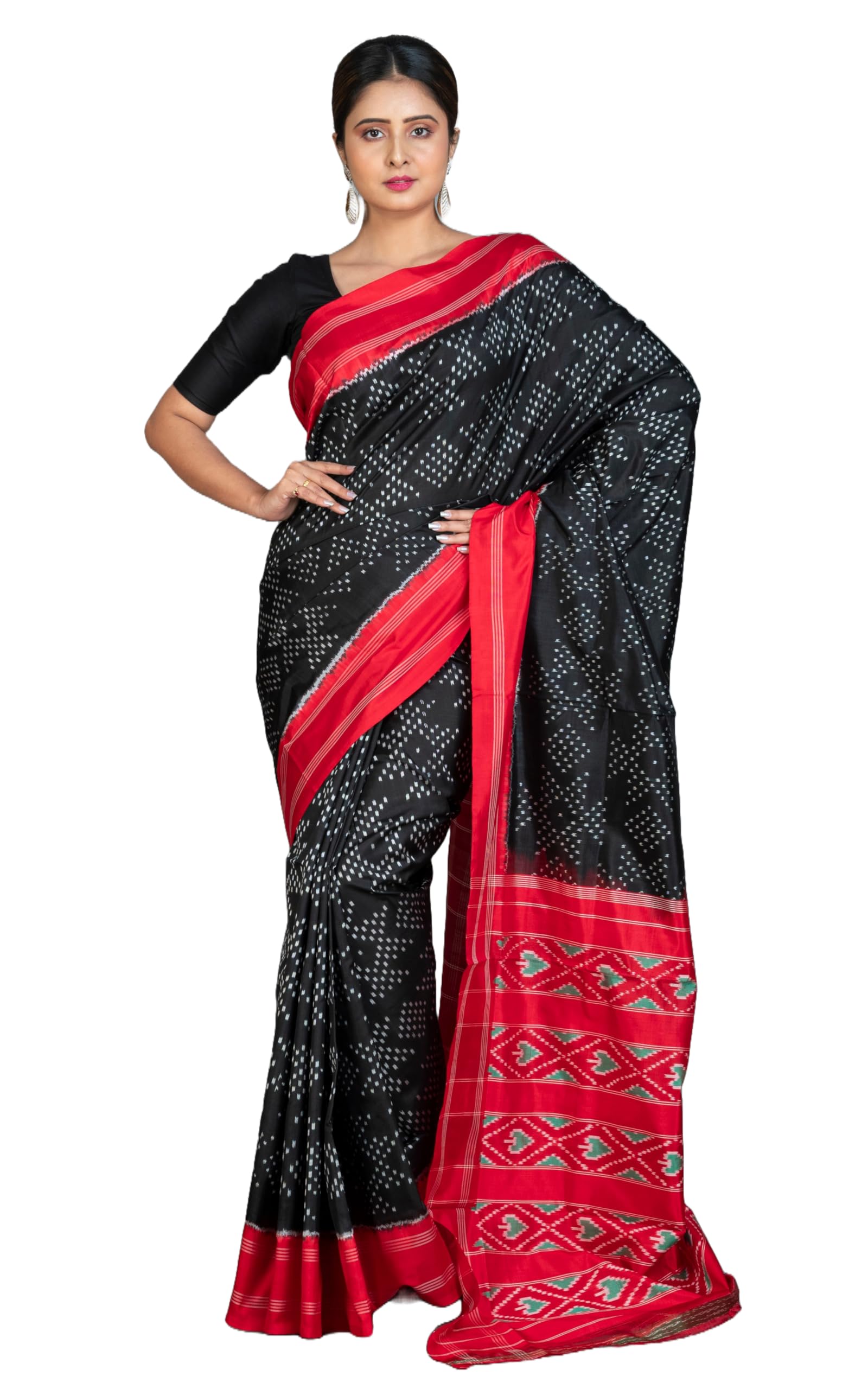 Bengal looms India Weaves of Elegance Twill Ikkat Pochampally Silk Saree For Women in Black, Red, Off White and English Green