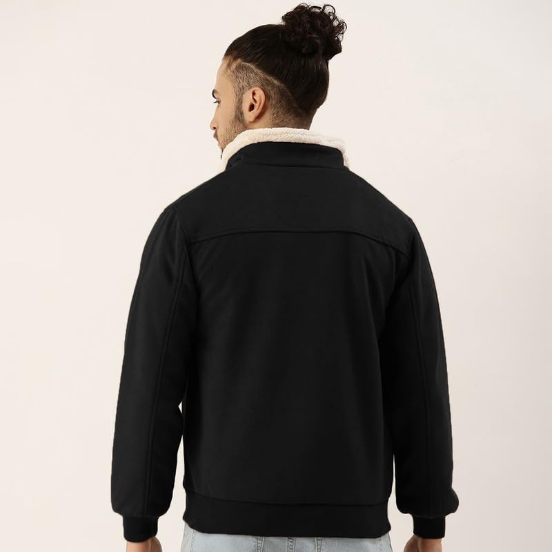 Campus Sutra Men’s Obsidian Black Fur-Lined Suede Bomber Jacket For Casual Wear | High Neck | Long Sleeve | Zipper Closure | Jacket Crafted With Comfort Wear For Everyday Wear
