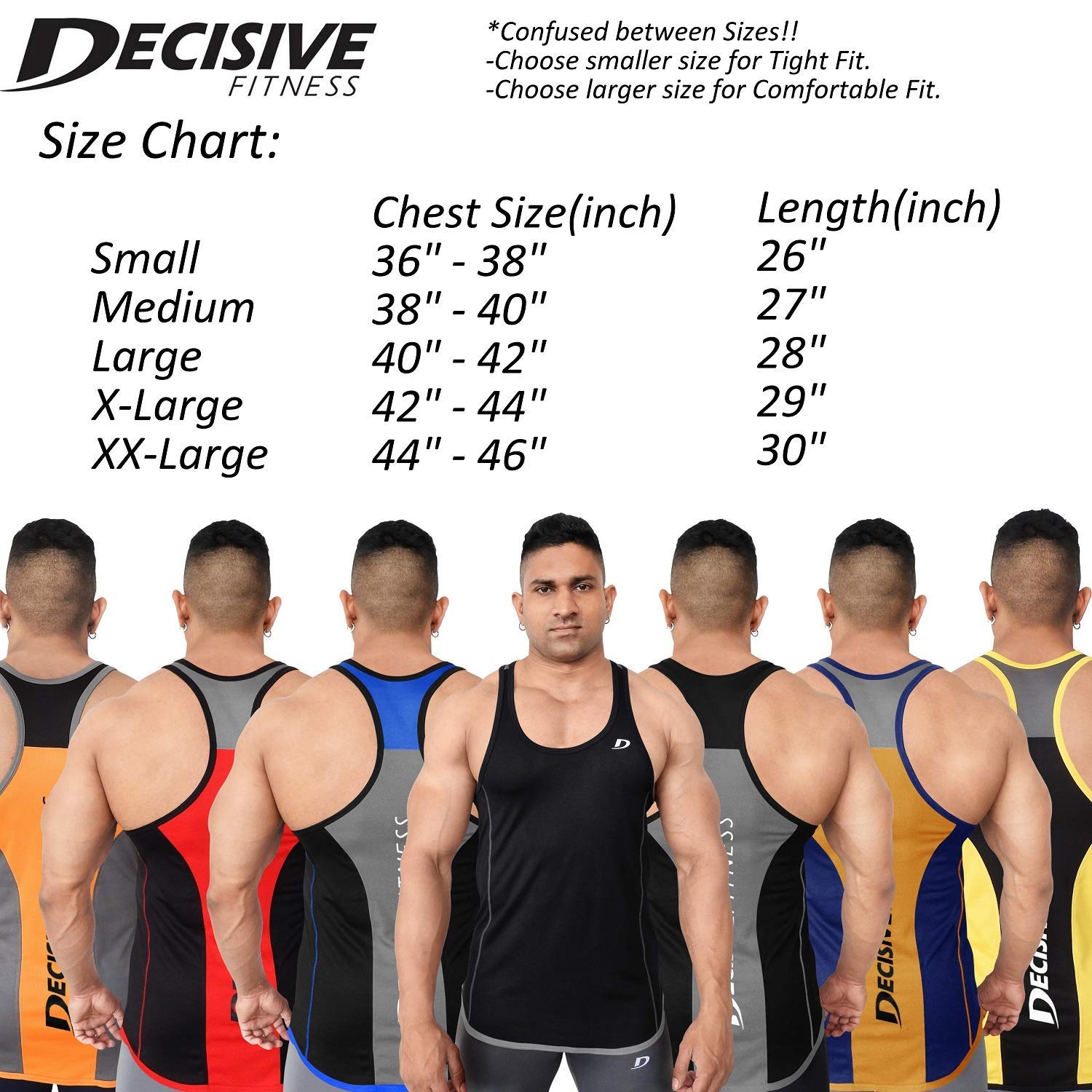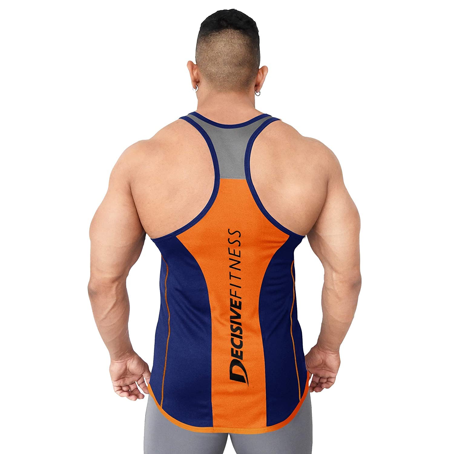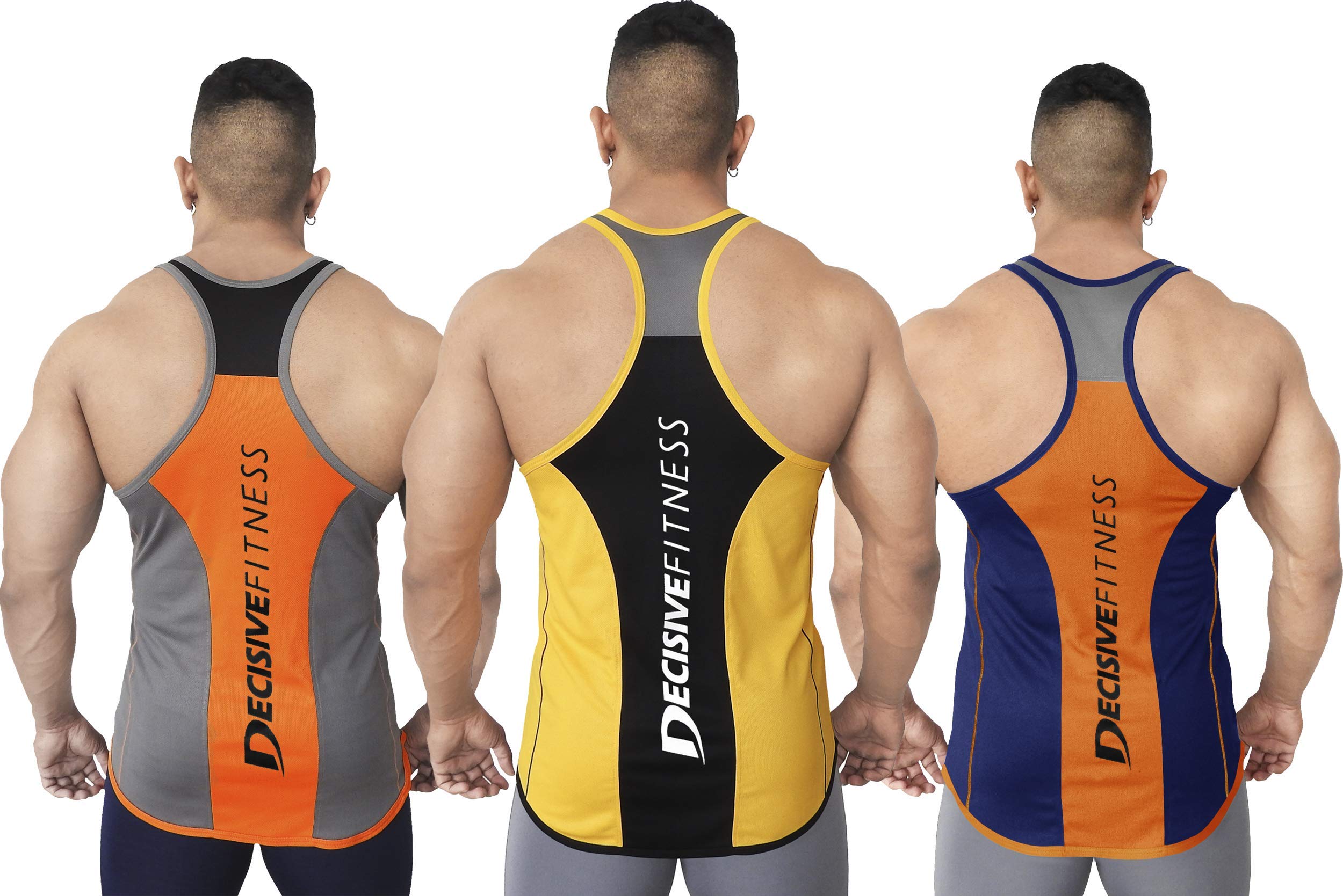 DECISIVE Men’s Fitness Gym Stringer Vest Tank Tops Sando (Navy-Orange, Grey-Orange, Yellow-Black, Large – 40″ Chest) – 3 Pack