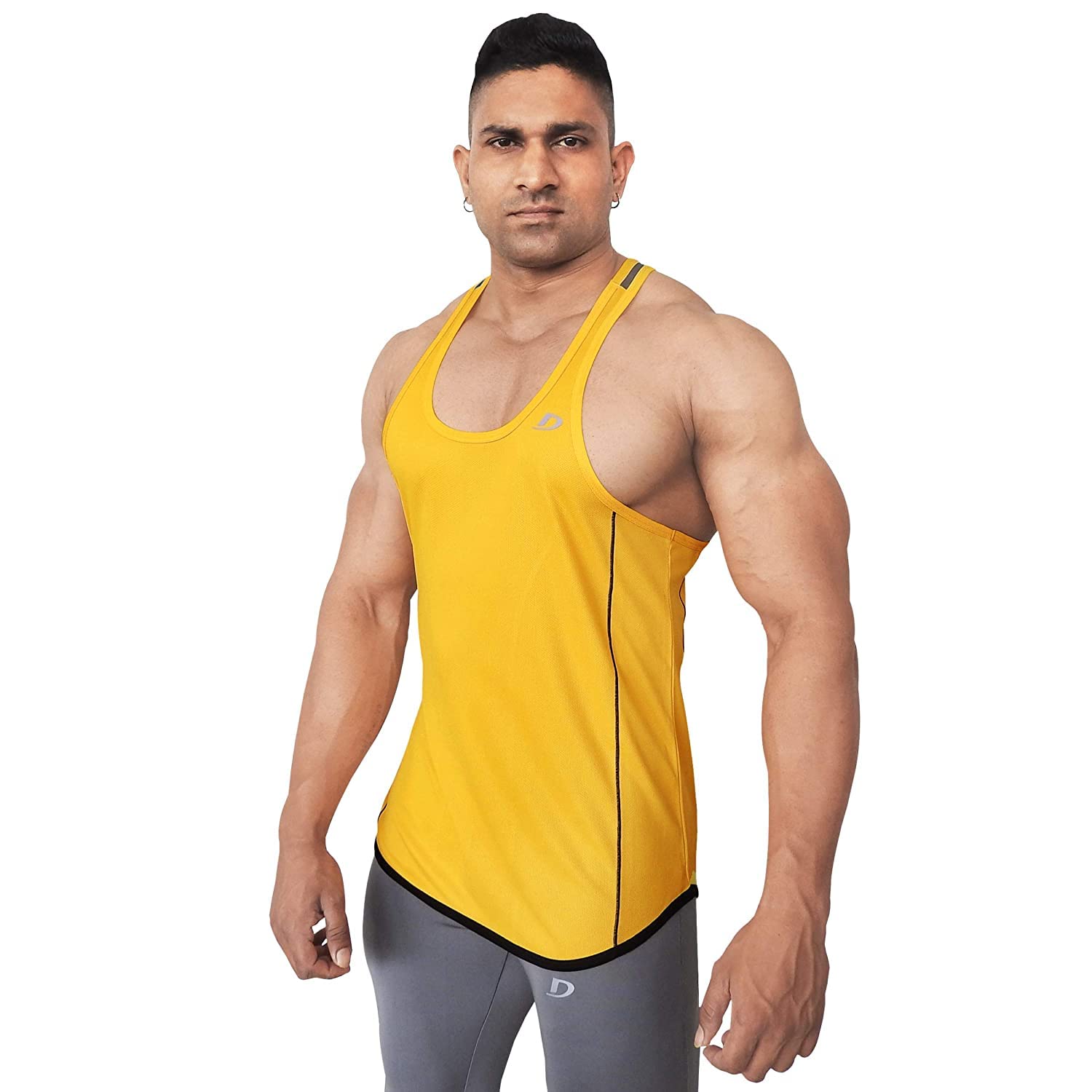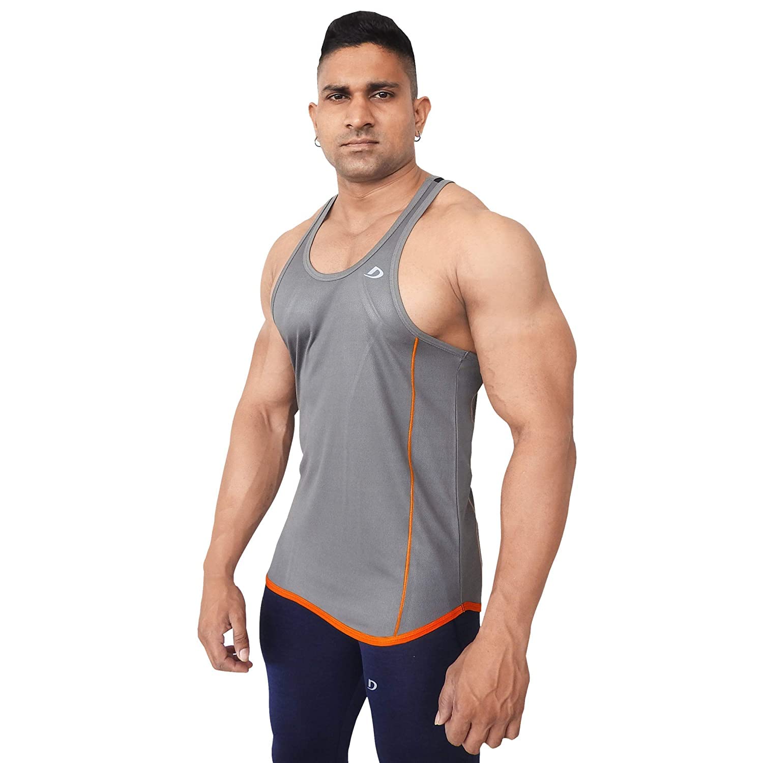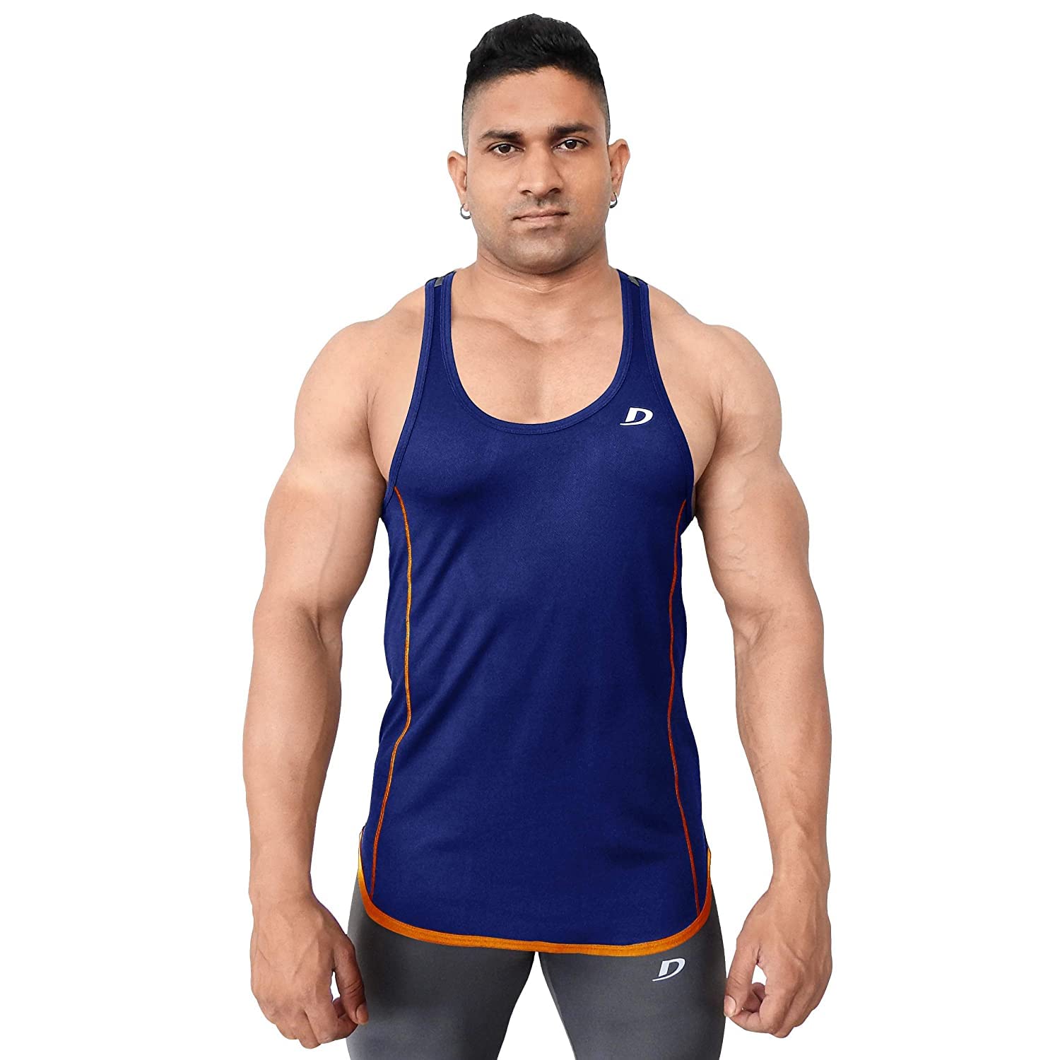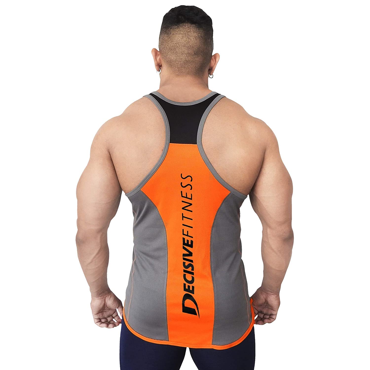 DECISIVE Men’s Fitness Gym Stringer Vest Tank Tops Sando (Navy-Orange, Grey-Orange, Yellow-Black, Large – 40″ Chest) – 3 Pack