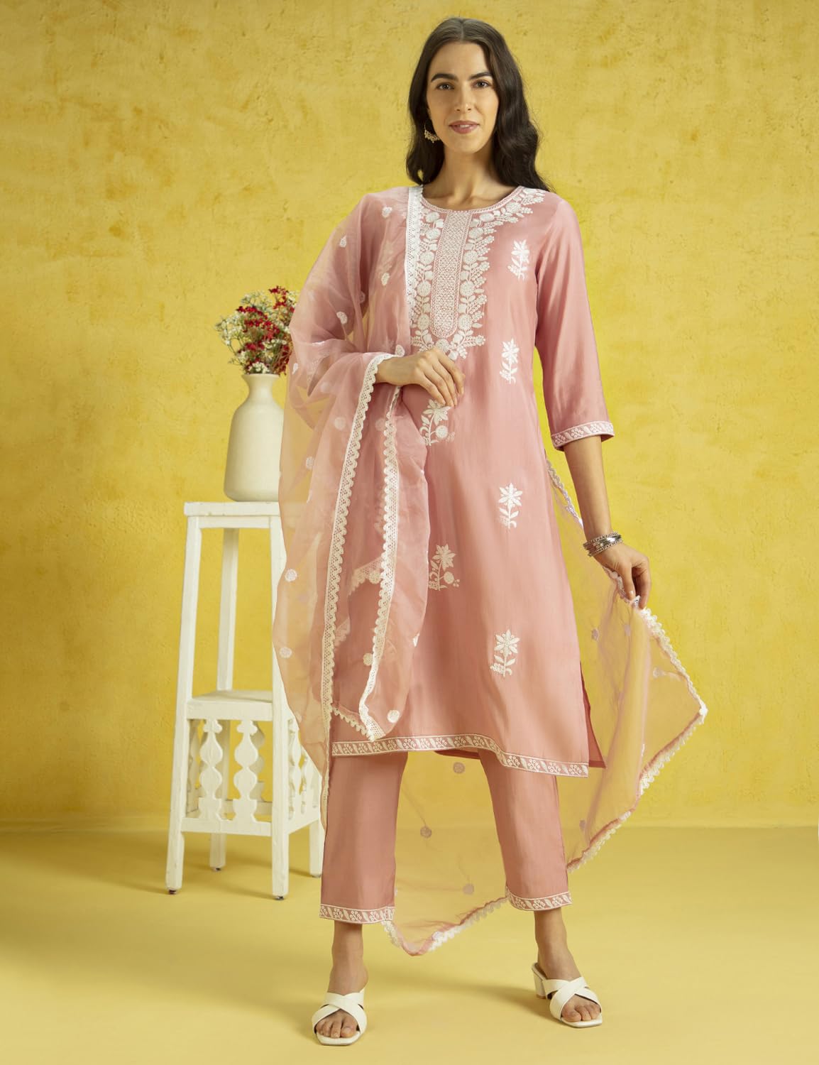 - Silk Blend: In the luxurious embrace of silk blend fabric, this straight-fit kurta features intricate thread embroidery that transforms each wear into a statement of elegance. Paired with matching pants and a sheer, delicately adorned dupatta, it elevates everyday moments into a graceful narrative.