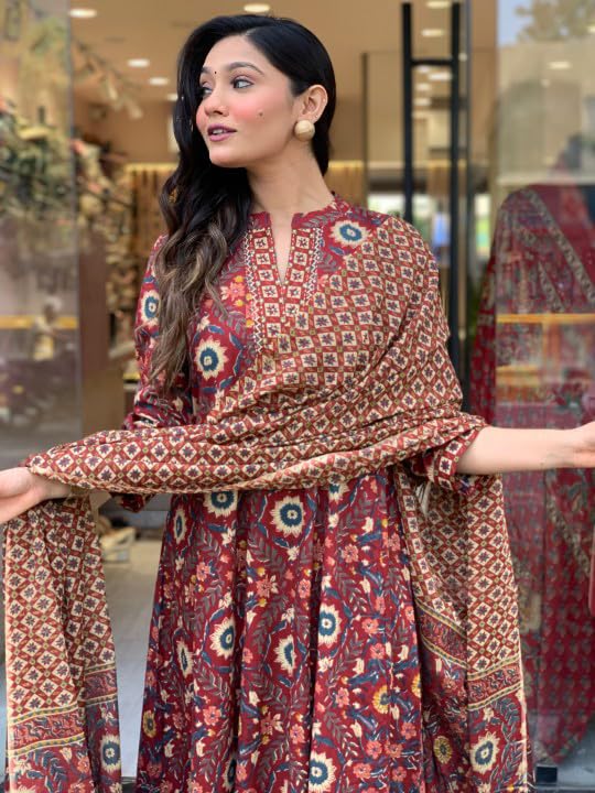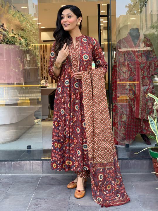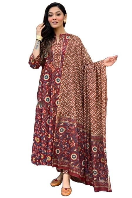 KLOSIA Women Printed Anarkali Kurta and Pant With Dupatta (IN, Alpha, 2XL, Regular, Maroon)