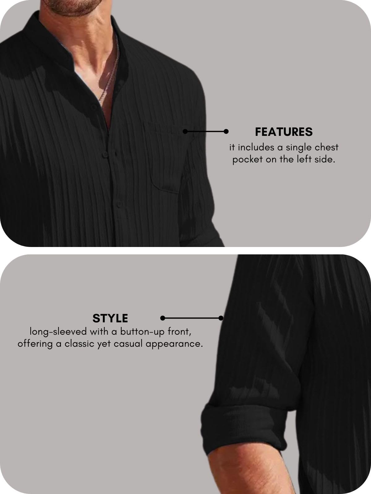 • Versatile Wear: Ideal for any occasion, this casual shirt for men easily transitions from daywear to a black shirt for men that’s perfect for layering or formal events.