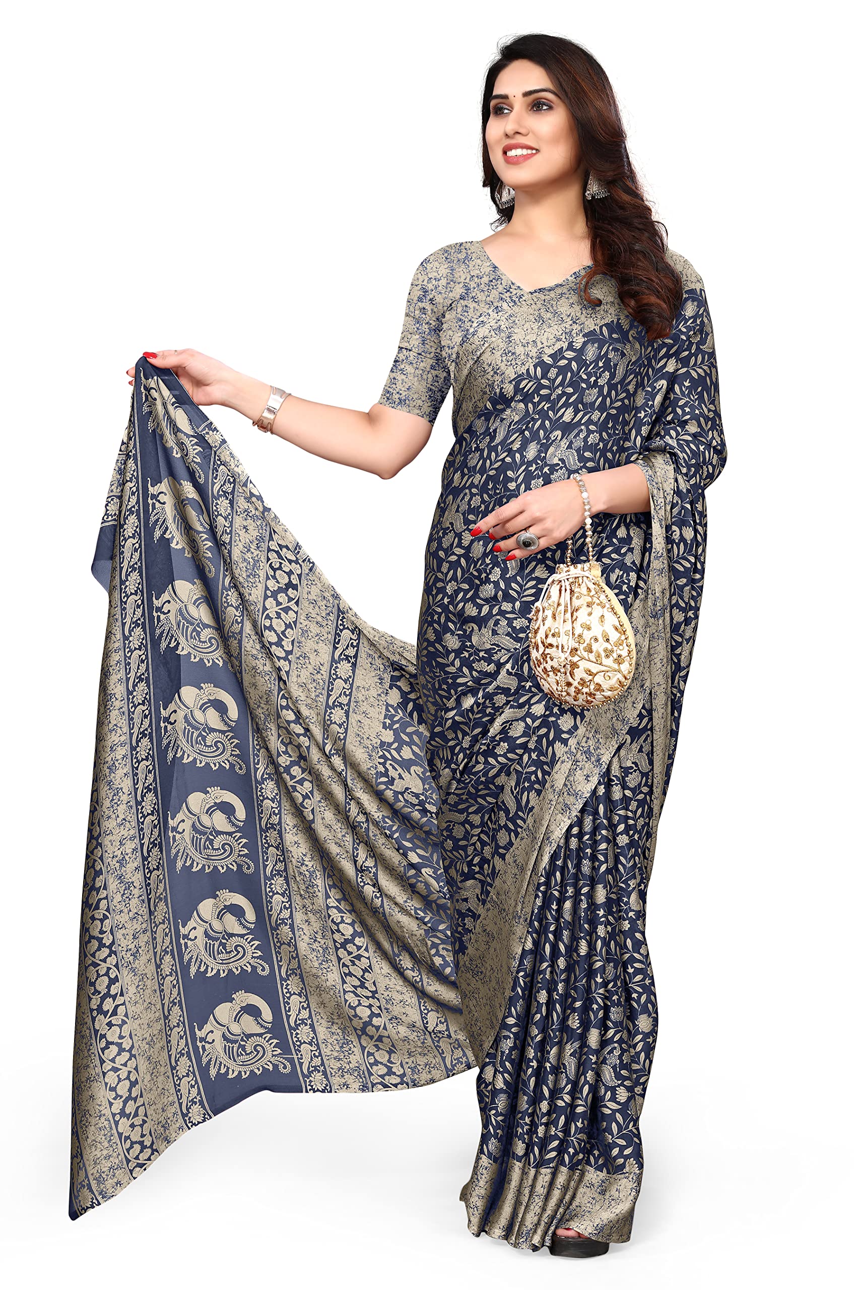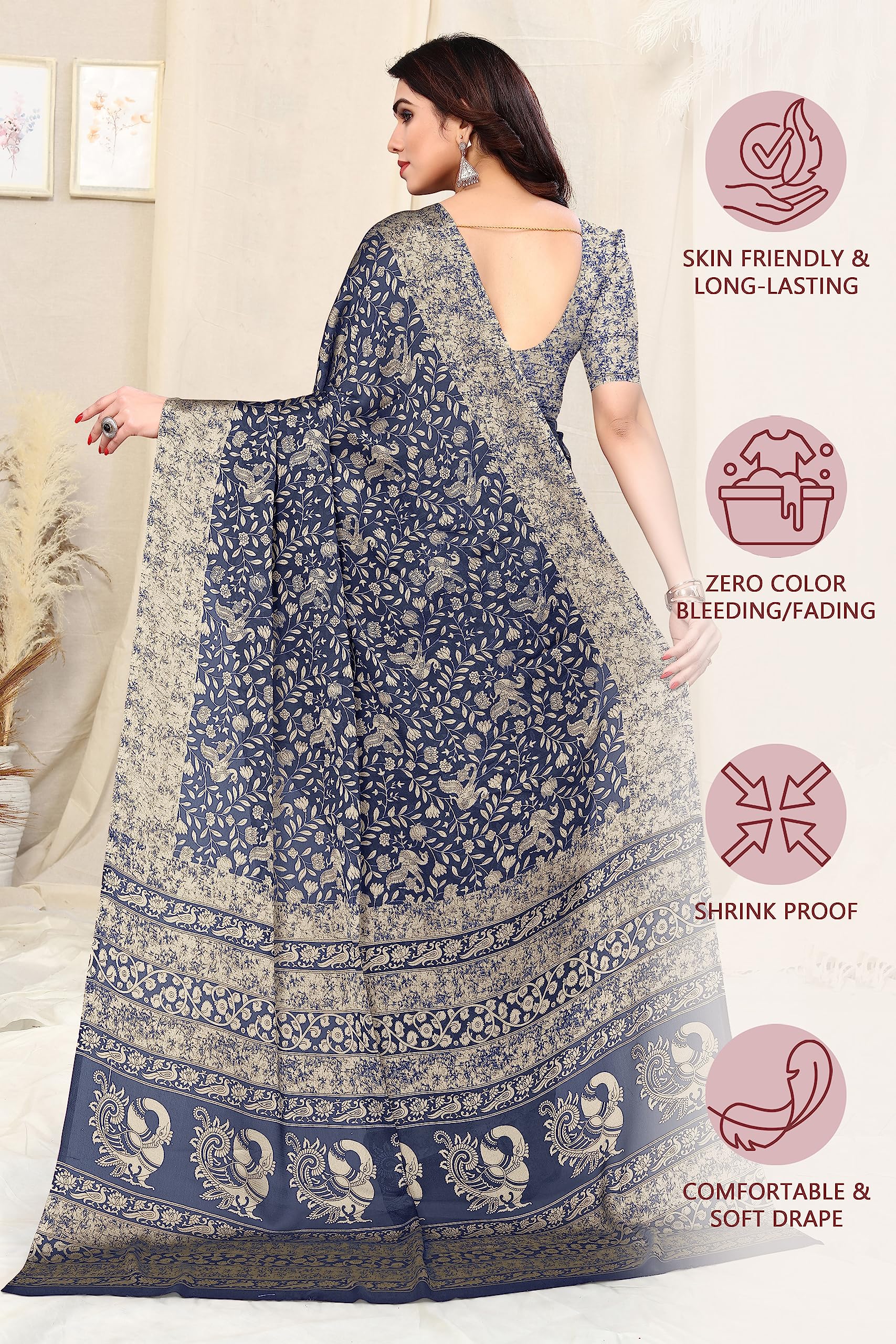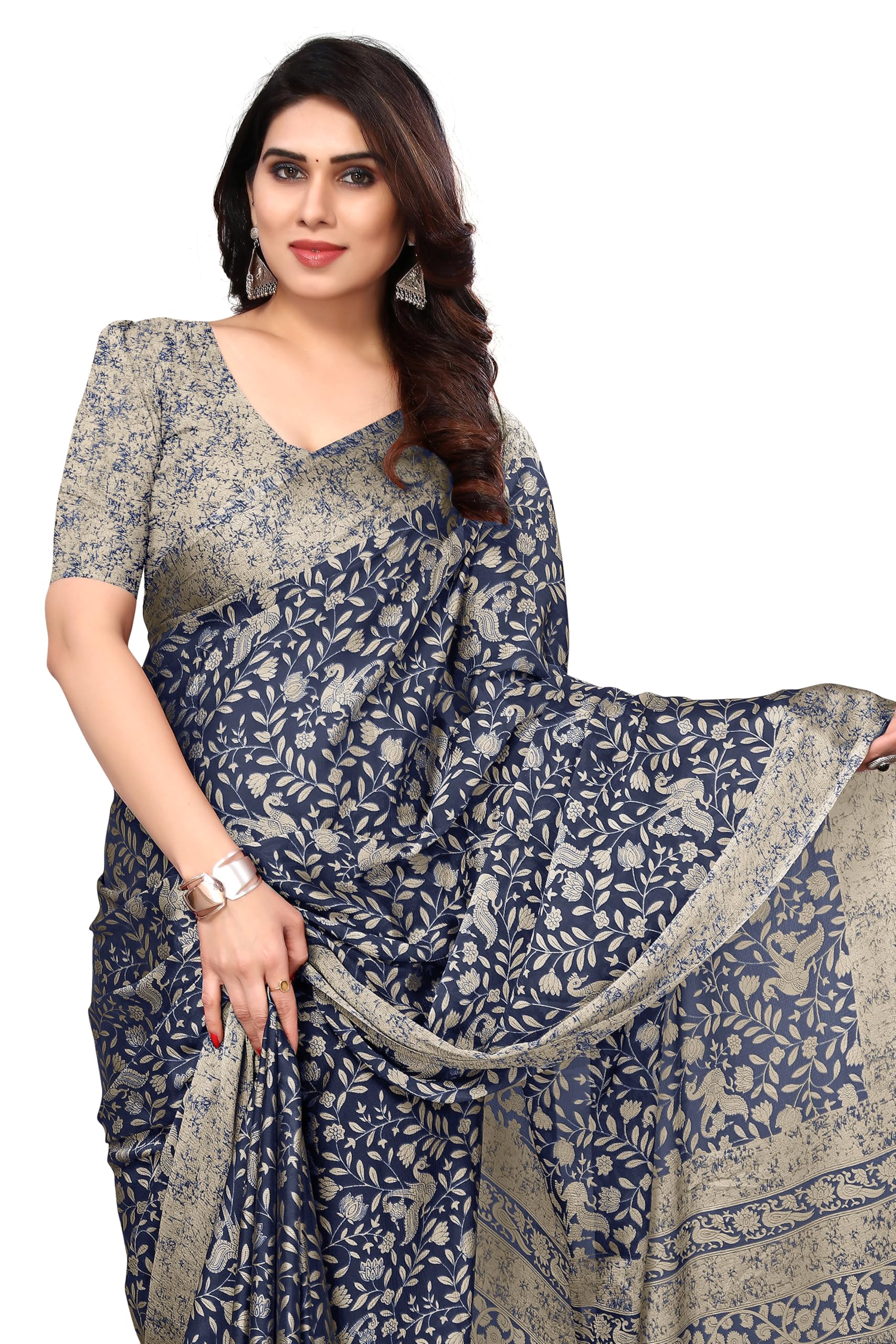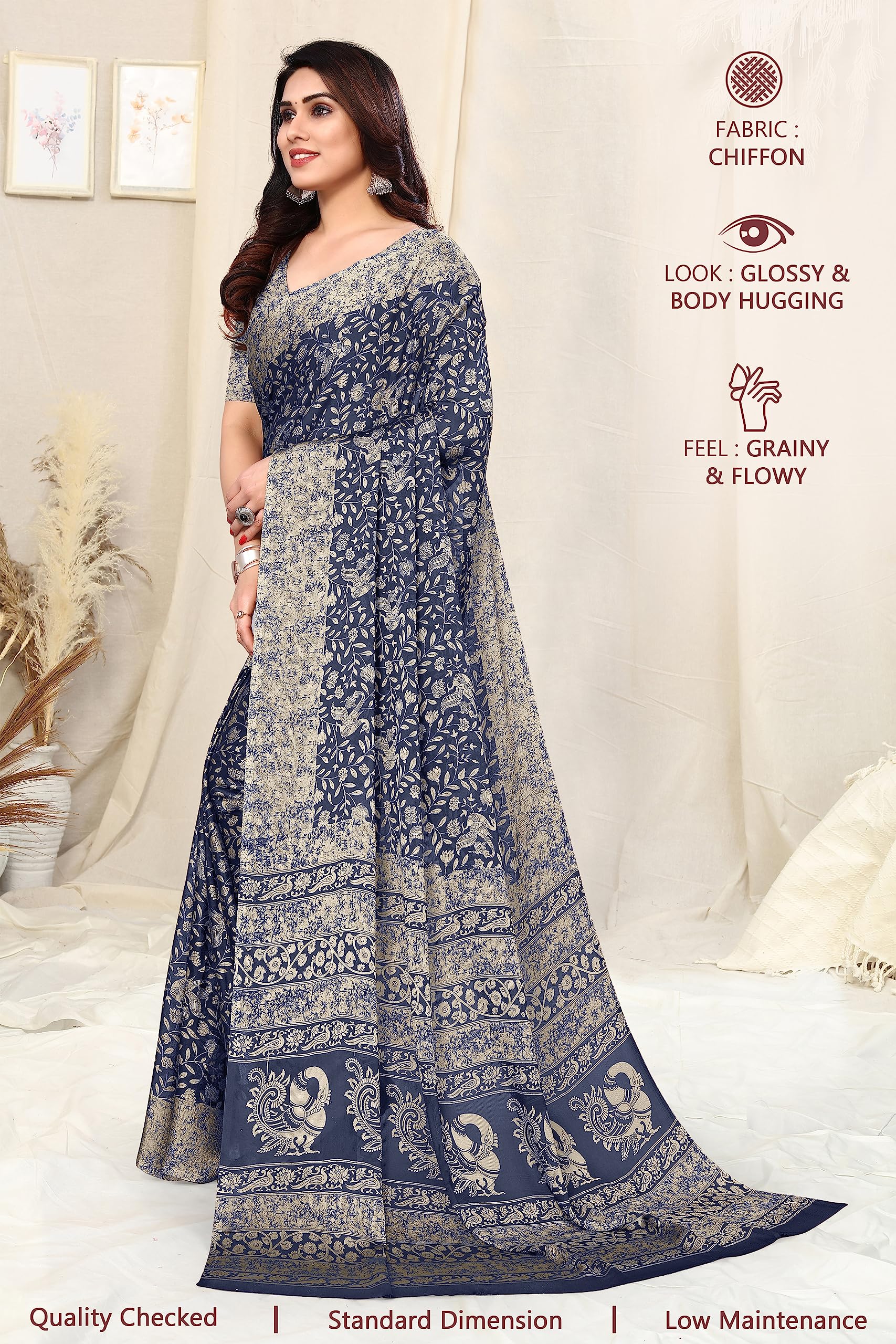 MIRCHI FASHION Chiffon Georgette Madhubani Printed Sarees for Women with Blouse Piece (38443-Navy Blue, Beige)