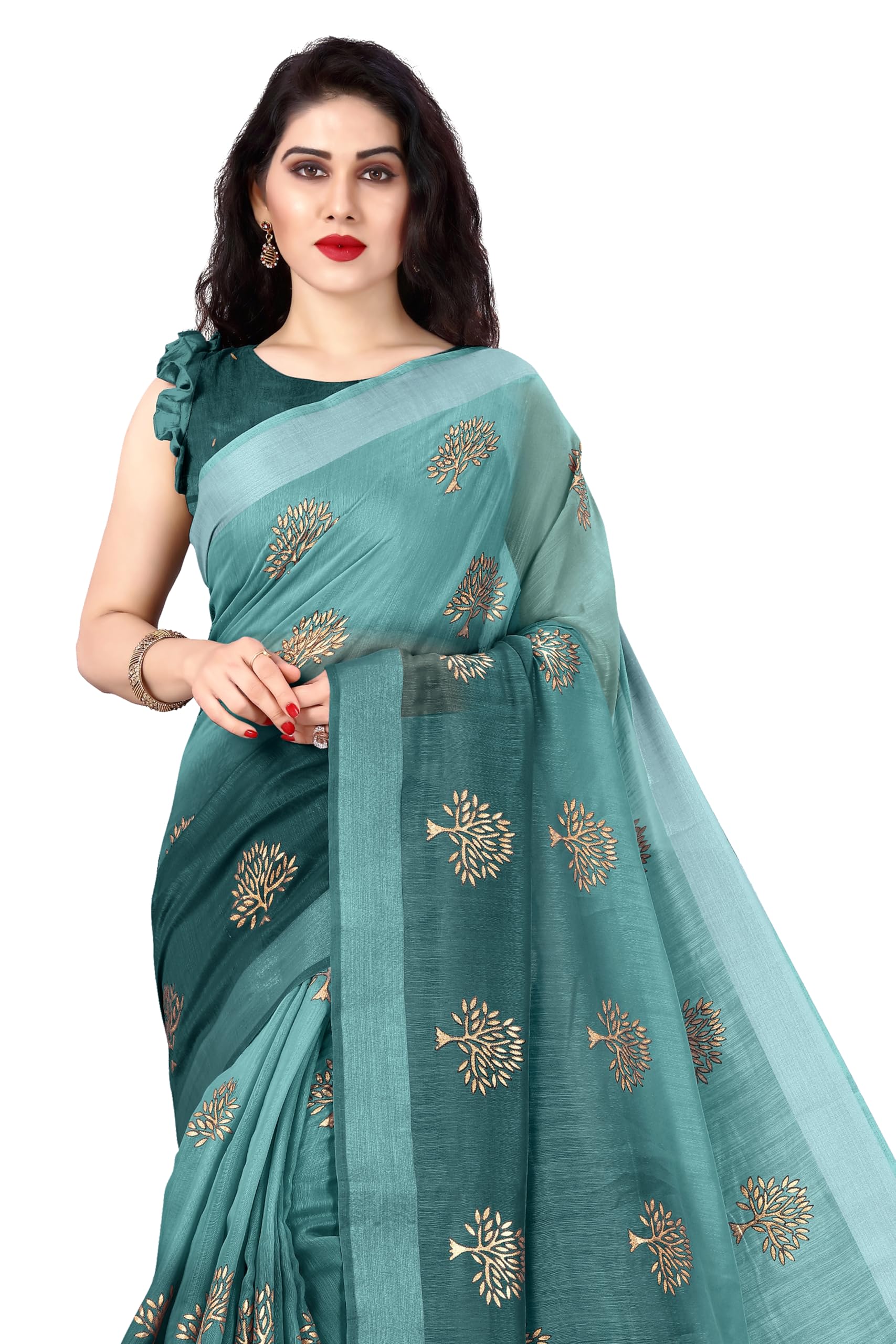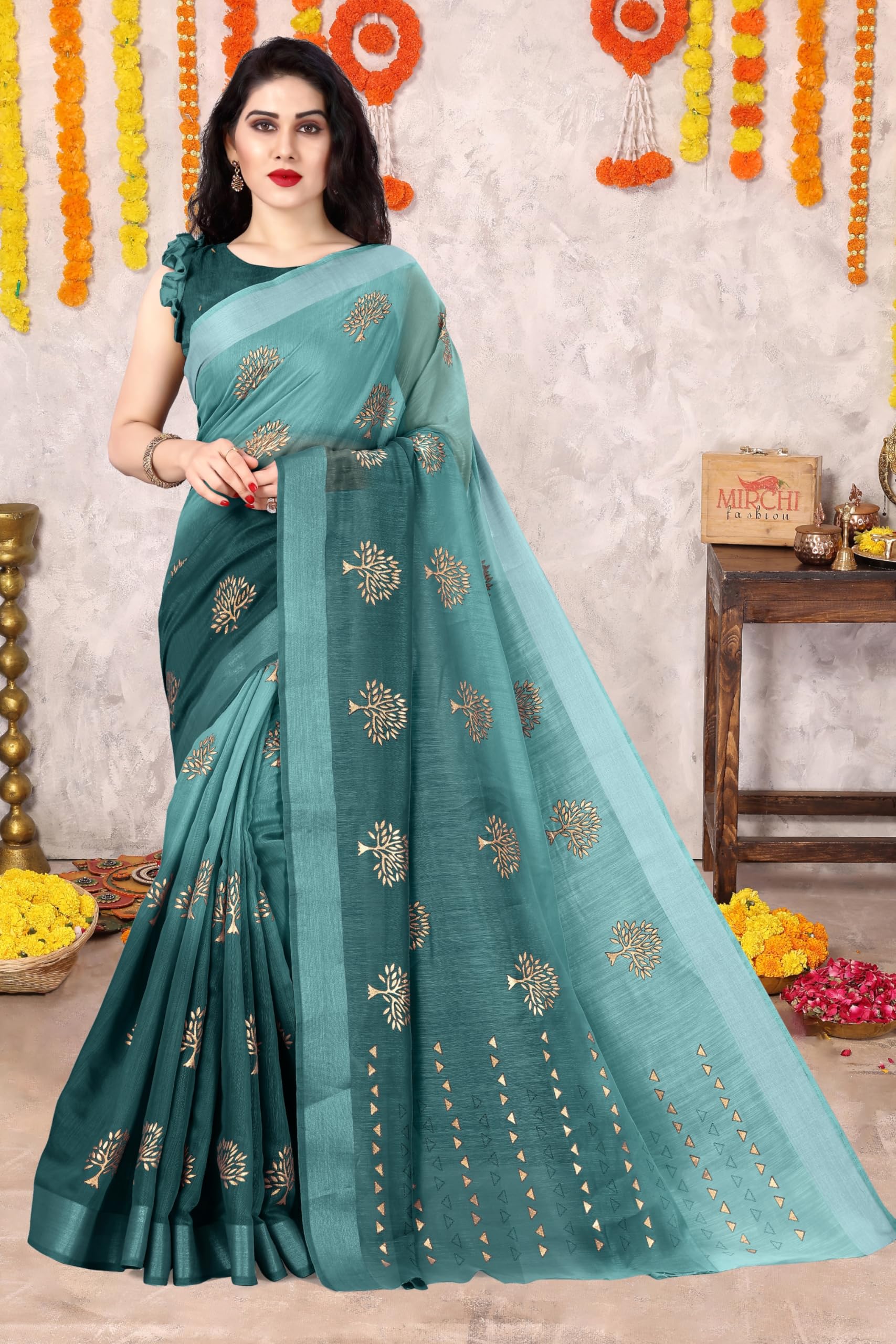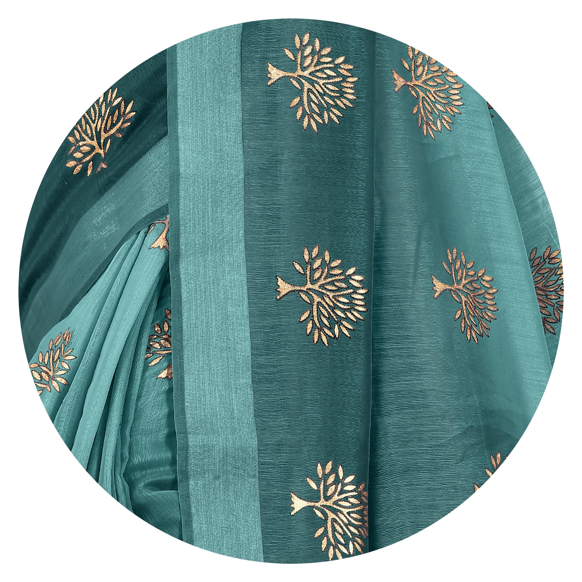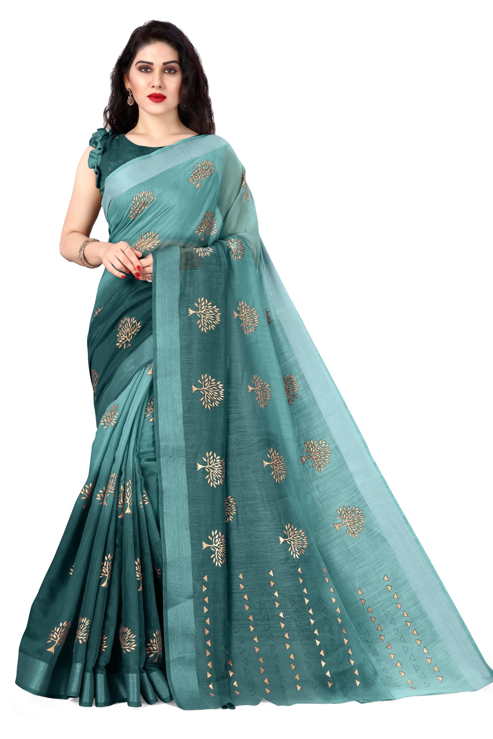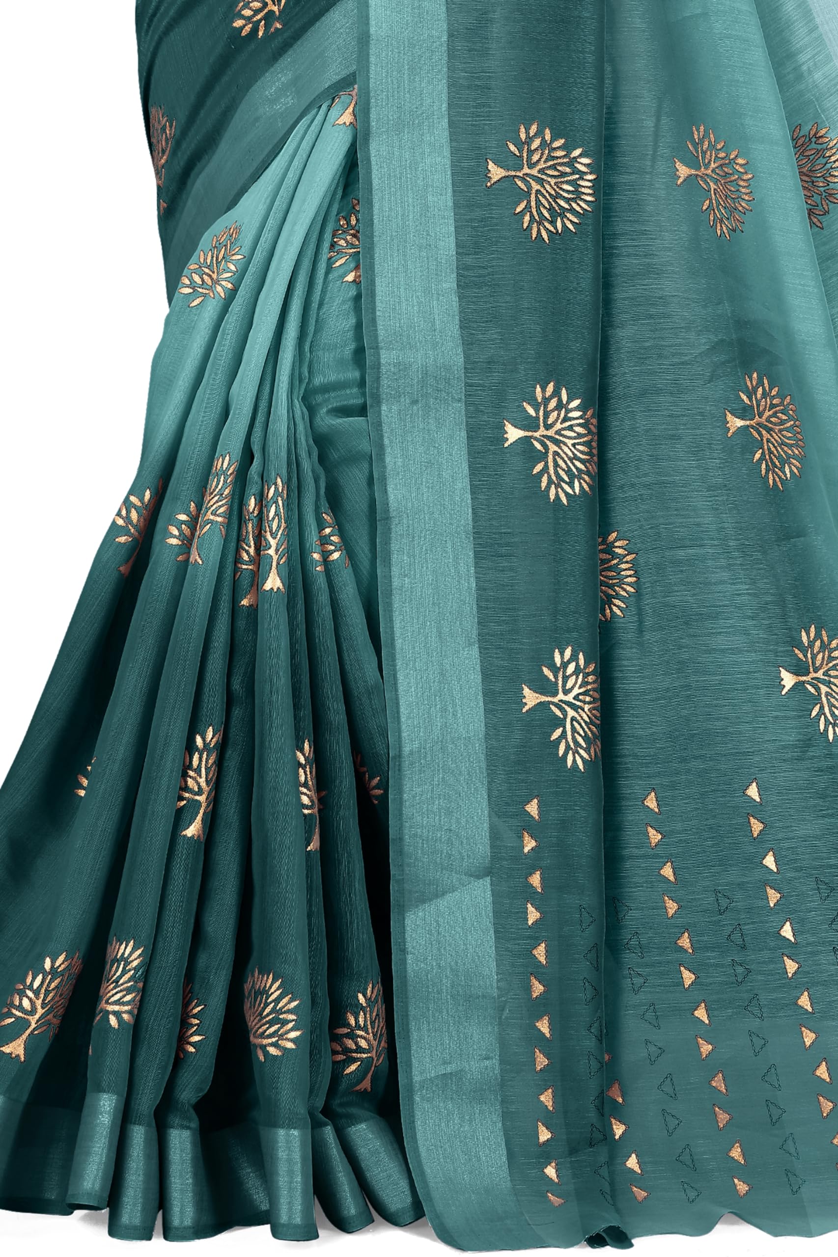 MIRCHI FASHION Women’s Cotton Blend Tree Block Pattern Foil Print Saree with Blouse Piece (24218-Teal, Gold)