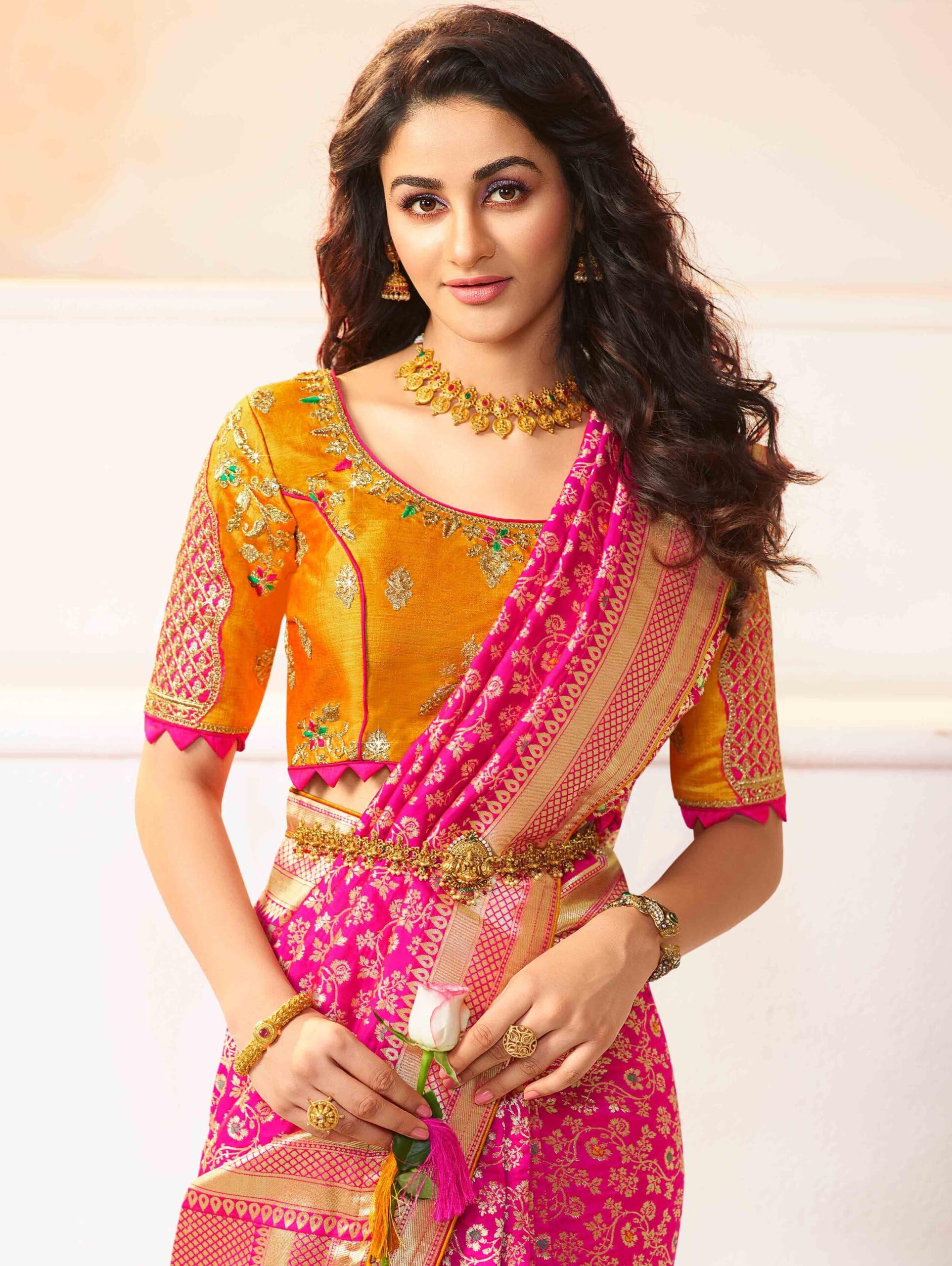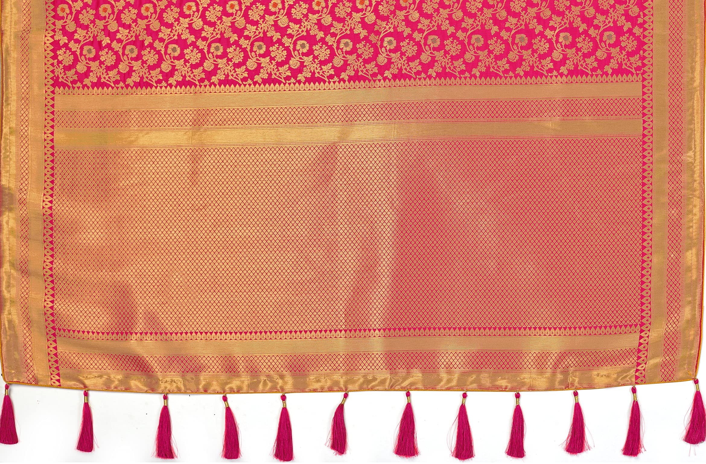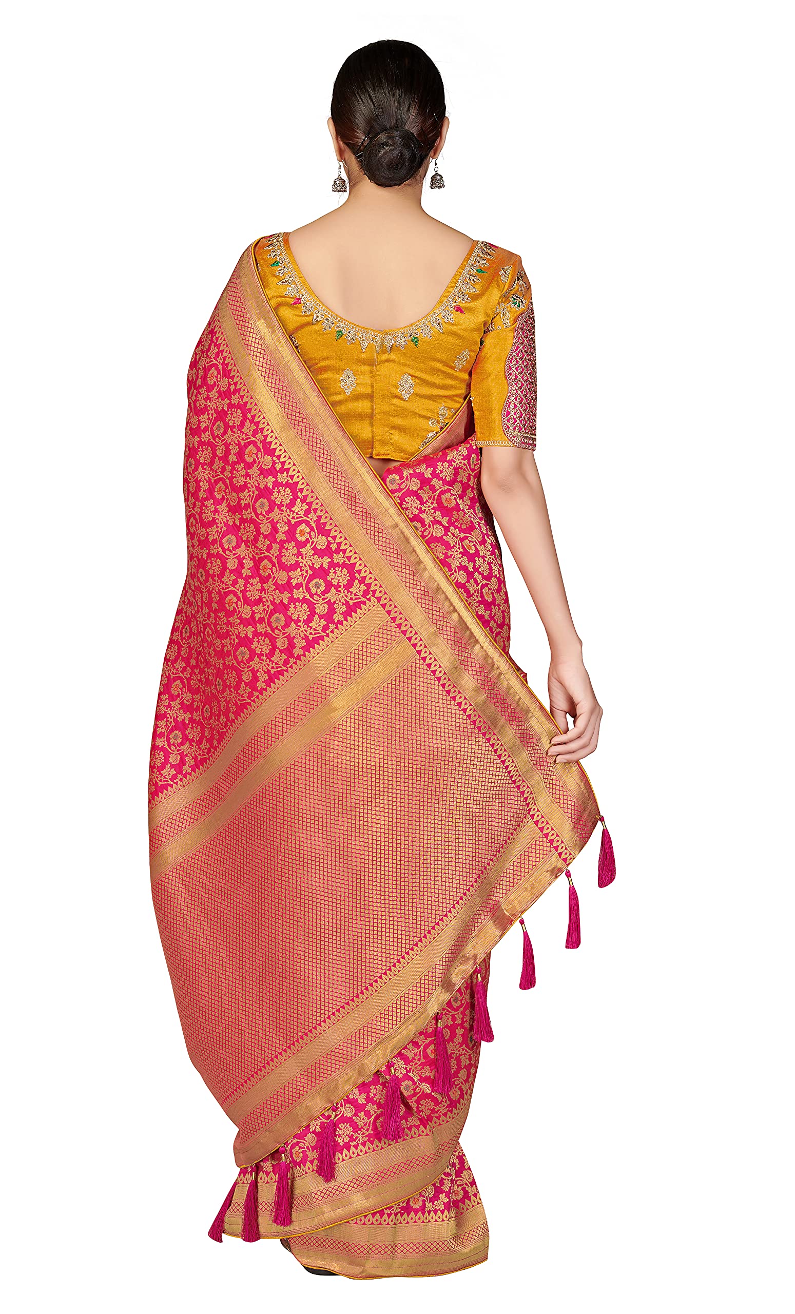 Monjolika Fashion Women’s Banarasi Silk Blend Woven Rani Pink Color Tussle Saree With Embroidered Work Blouse Piece (45555 Rani Pink)