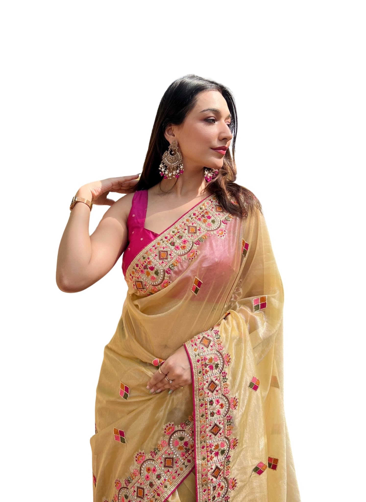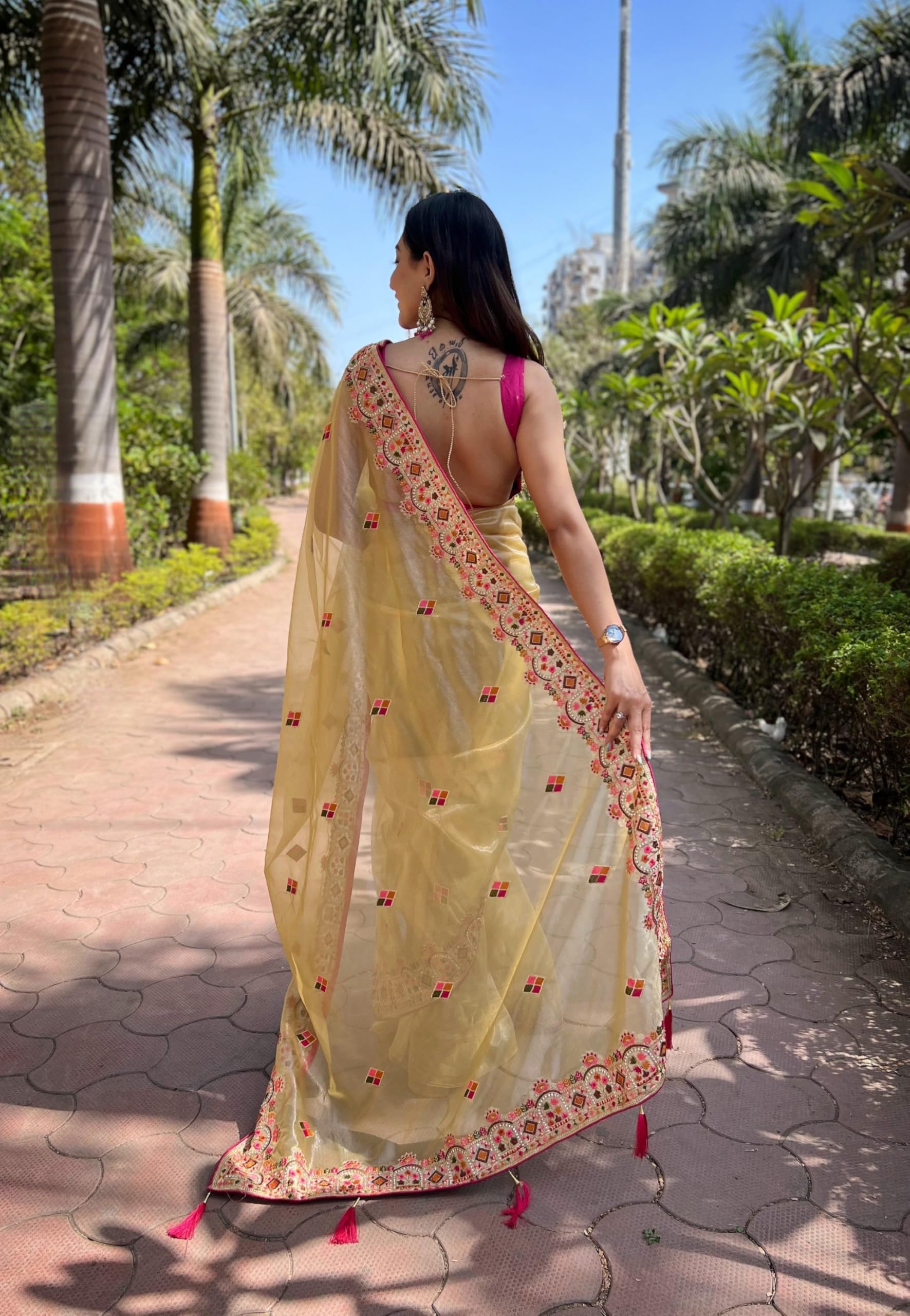 MUNIR Women’s Silver Tissue Net Beautiful Ethnic Saree With Unstiched Blouse Piece For Festival And Function (Yellow)