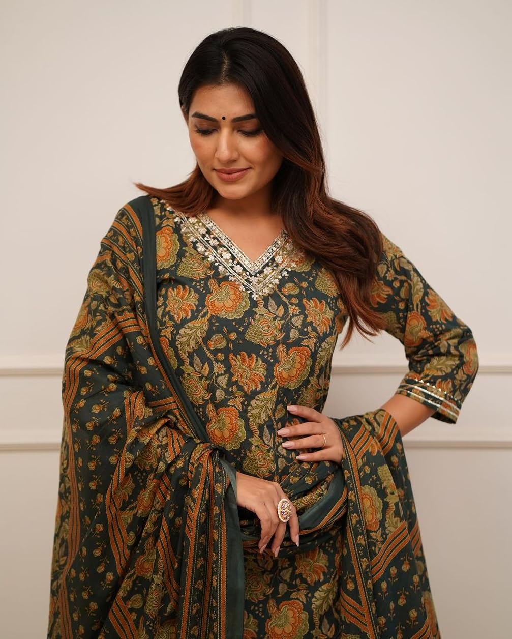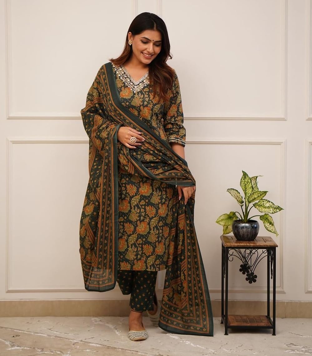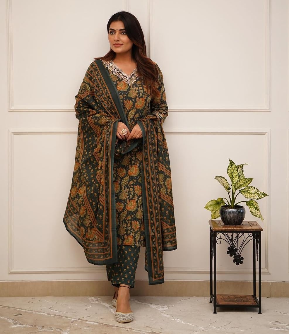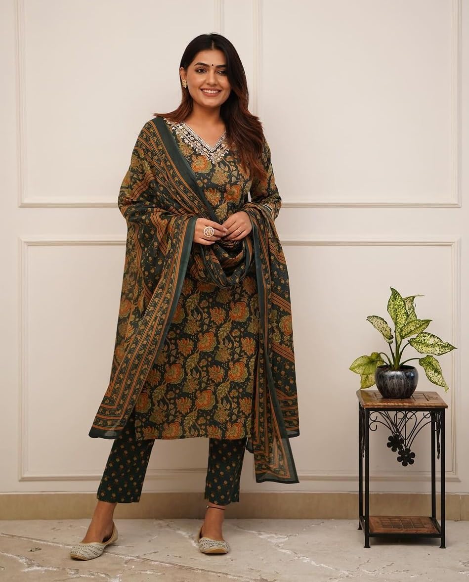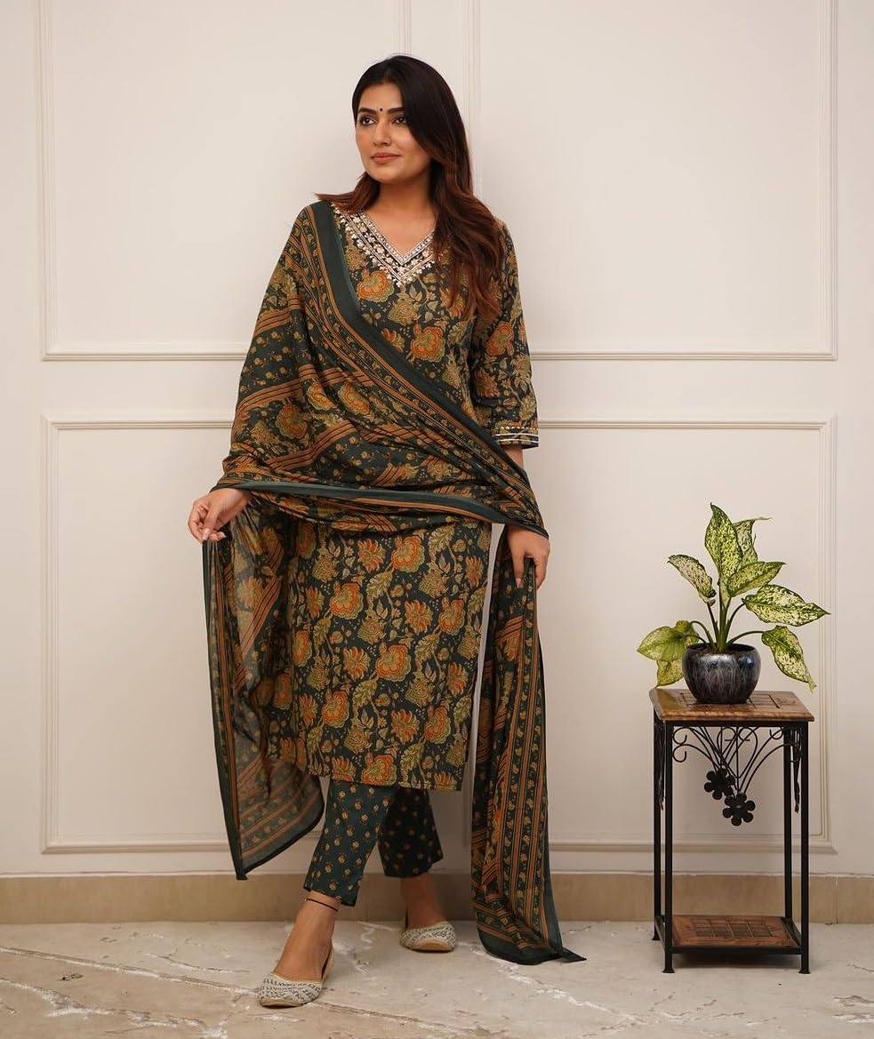Nermosa Women Printed Straight Kurta and Pant with Dupatta (in, Alpha, L, Green)