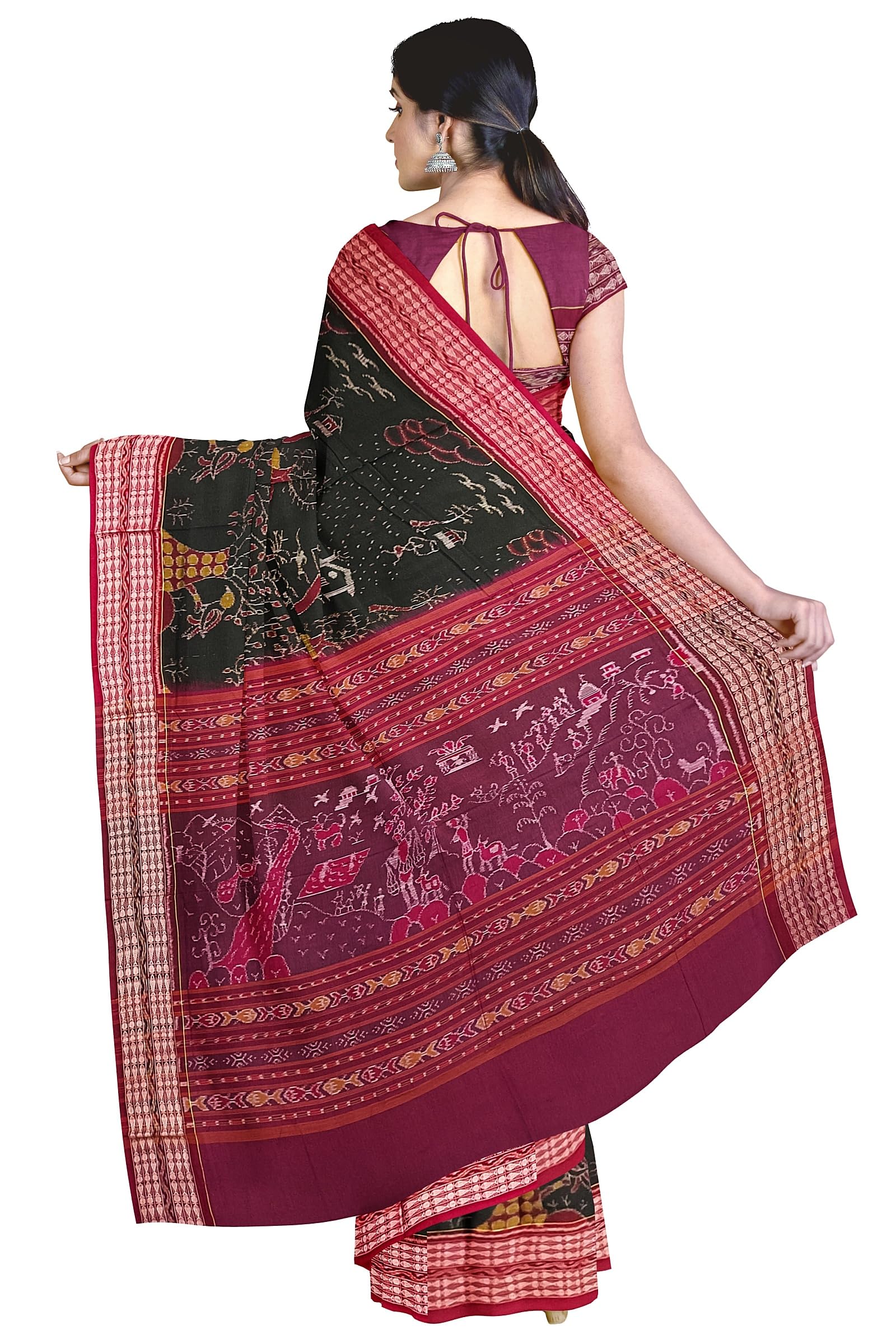 OdiKala Sambalpuri Cotton Saree with Blouse Piece, Village Life Design, Black Base with Maroon Border, Handloom, Traditional