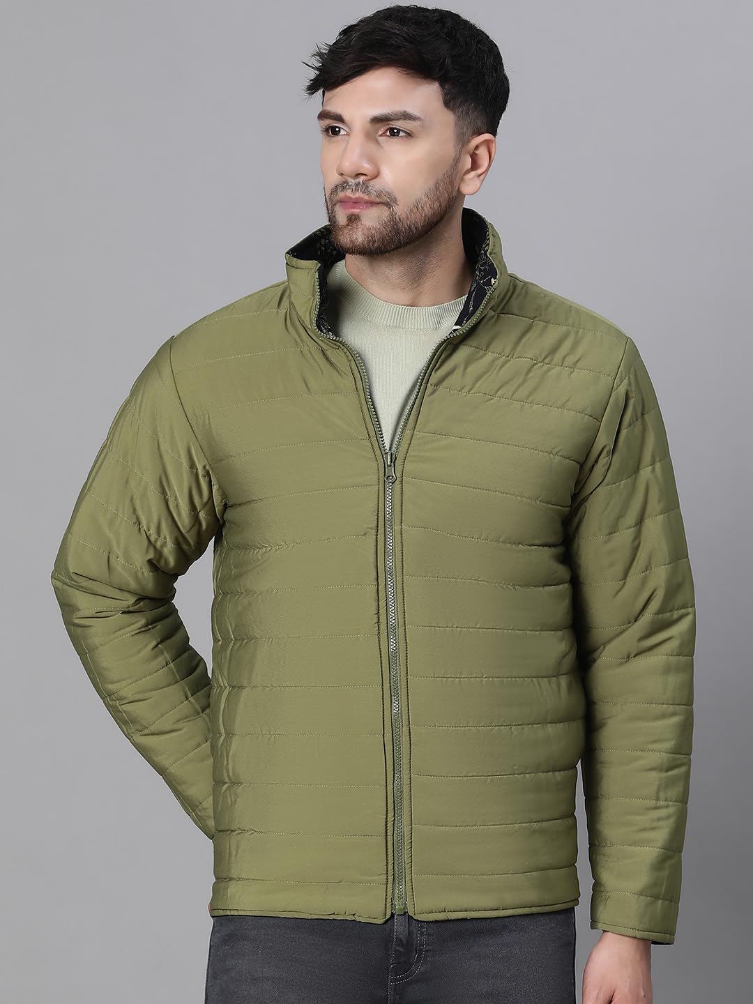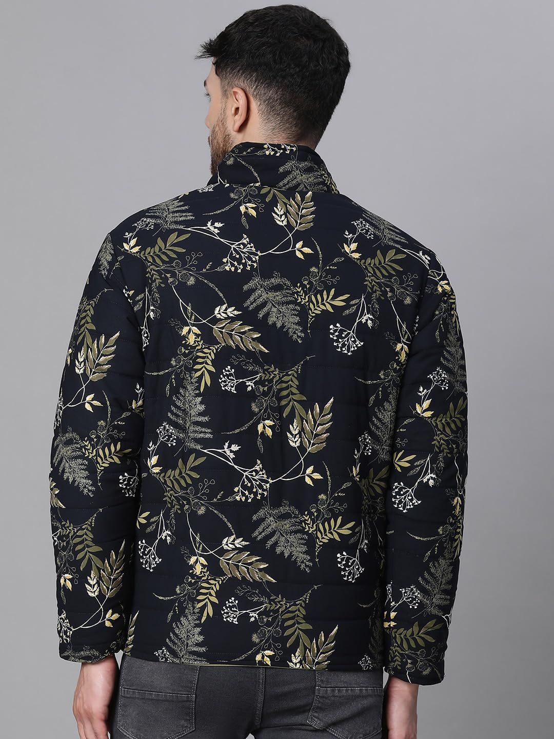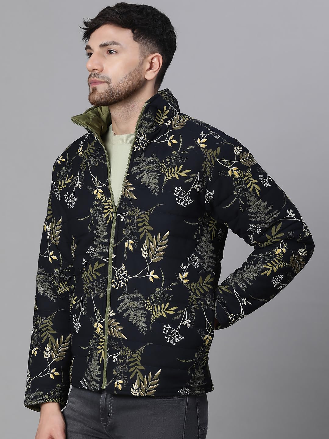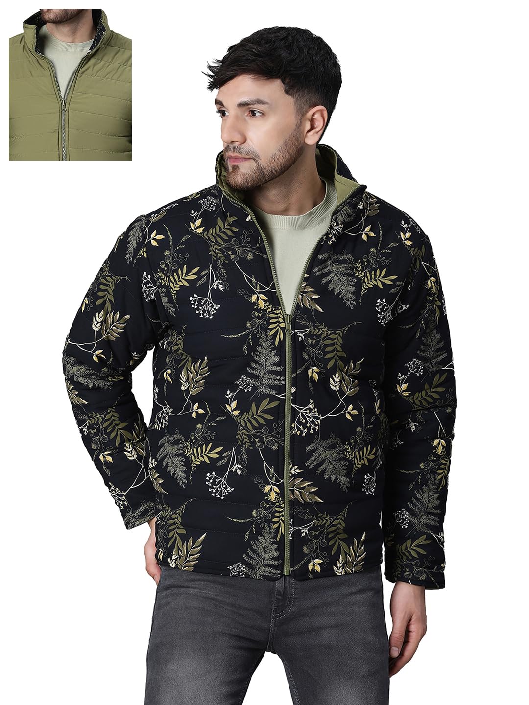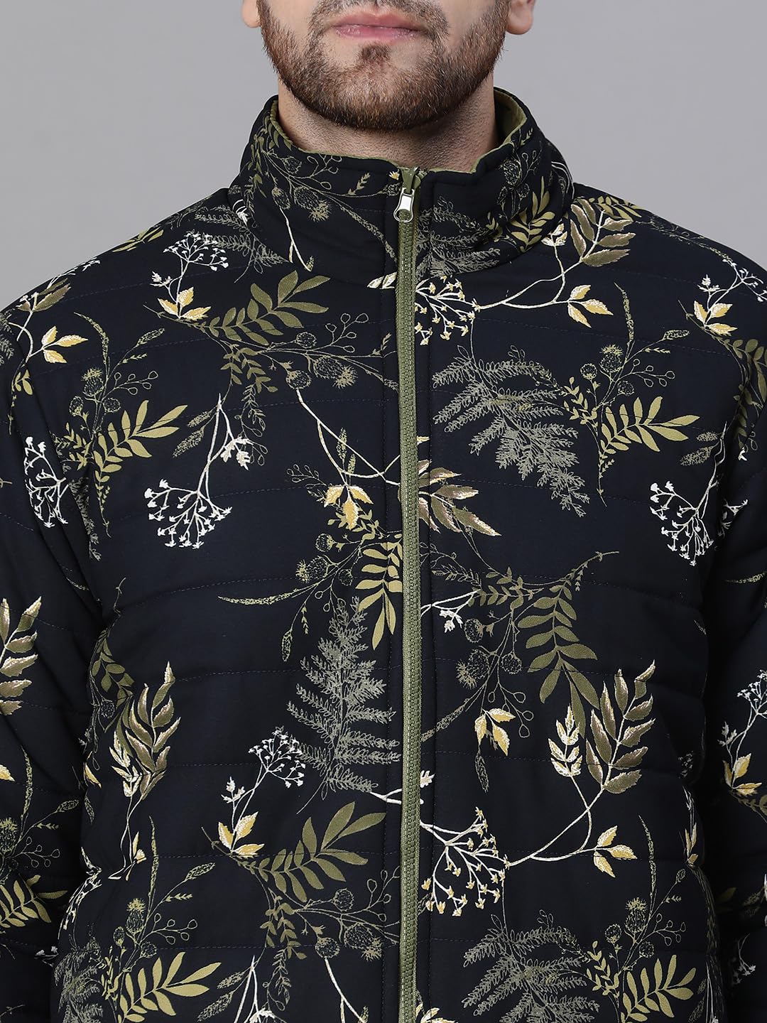 oxolloxo Men Floral Print Black & Green Zip Lined Long Sleeve Reversible Quilted Jacket