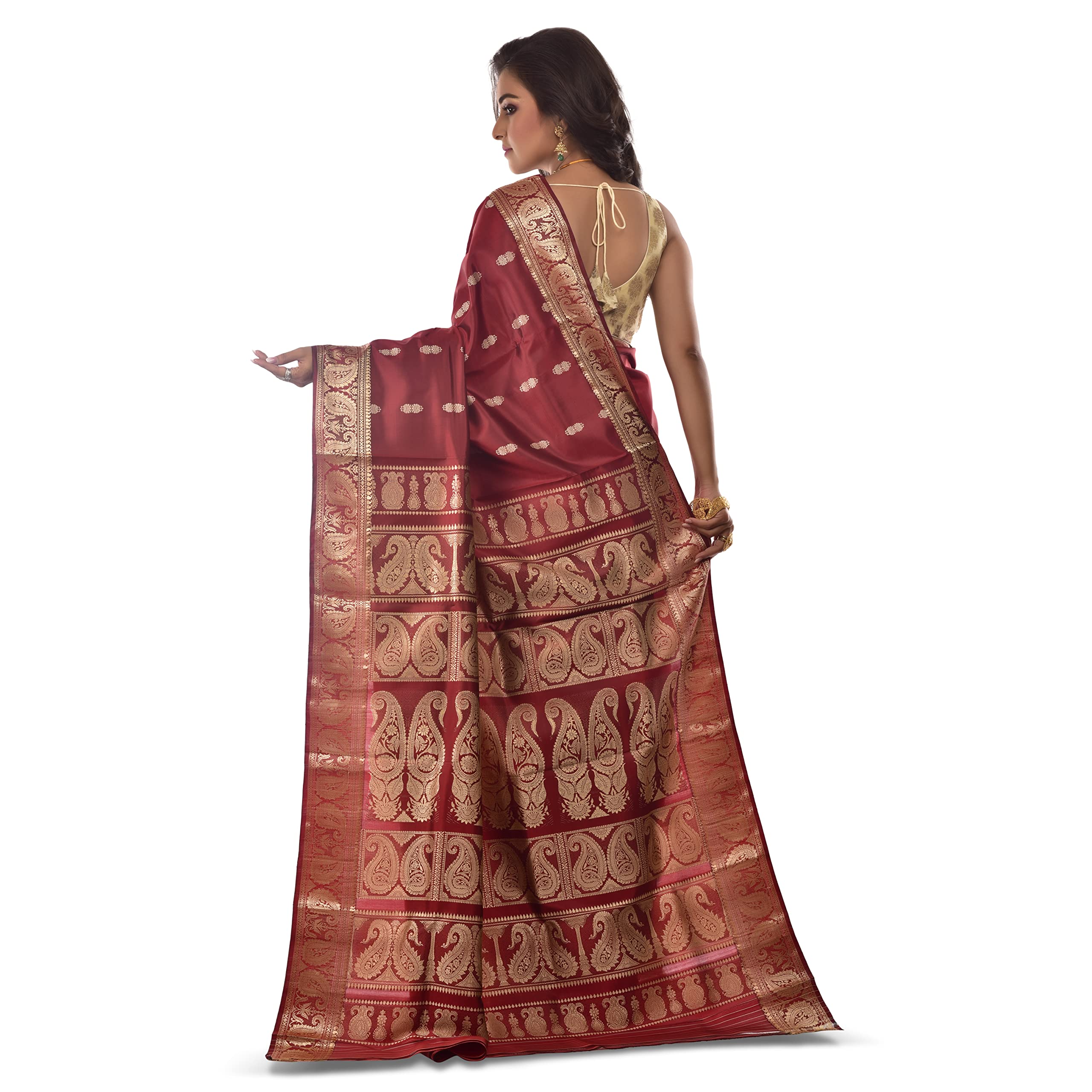 Handwoven Baluchari Silk Saree which is intricately designed by Weavers of Bisnupur. Made in fine quality Katan silk with beautiful motifs in meenakari and a splendid display of artwork in pallu, body and border depicting instances from Hindu Mythology. Unstitched blouse piece available.