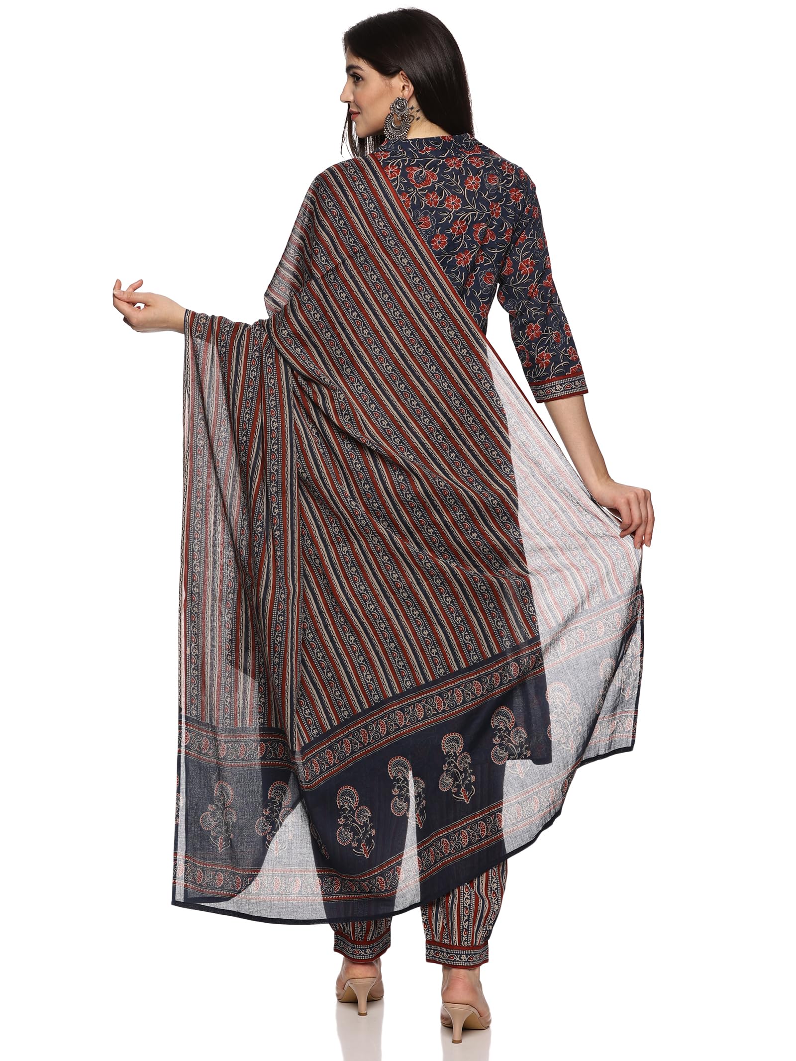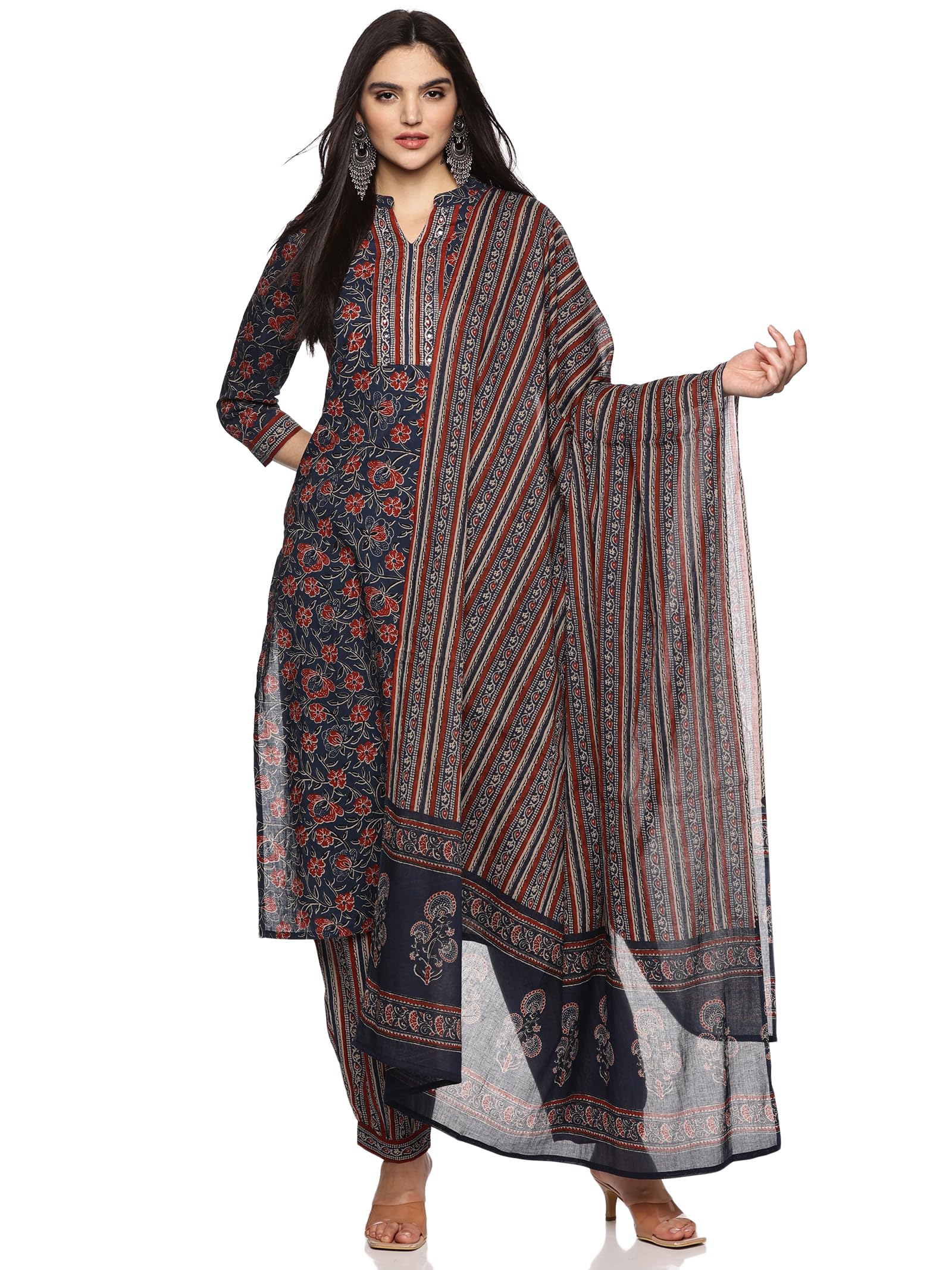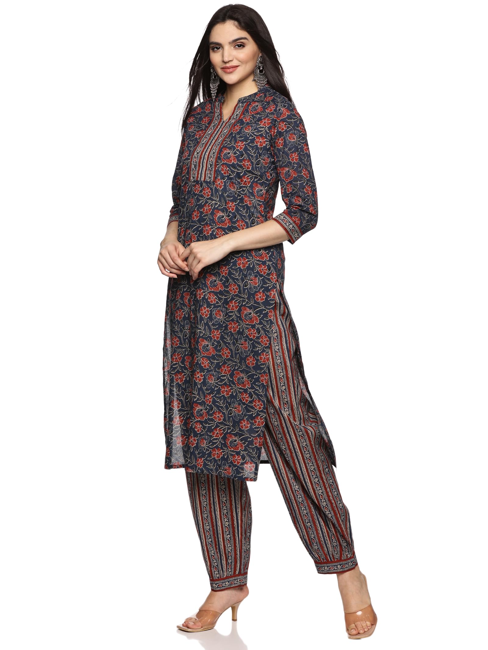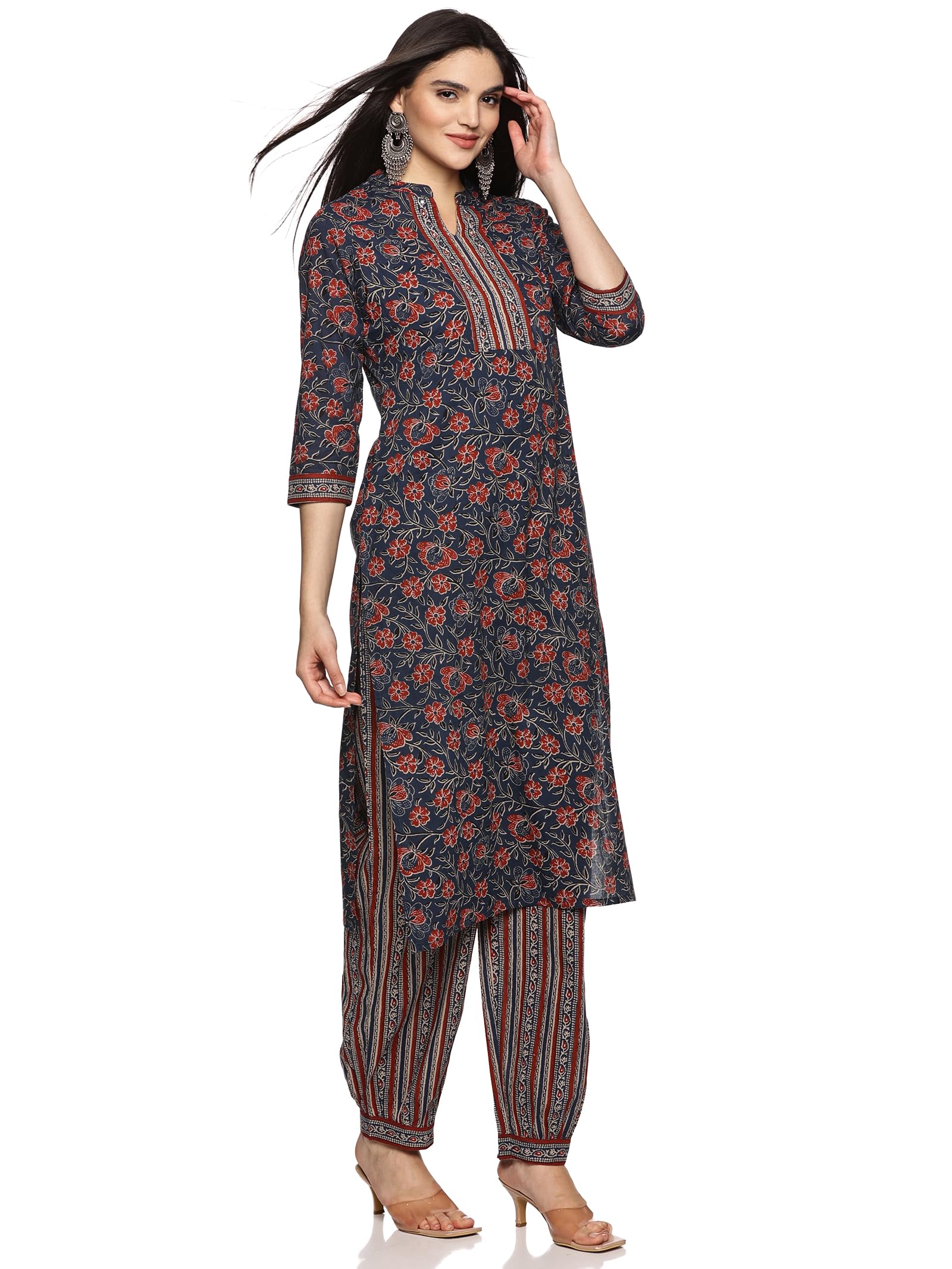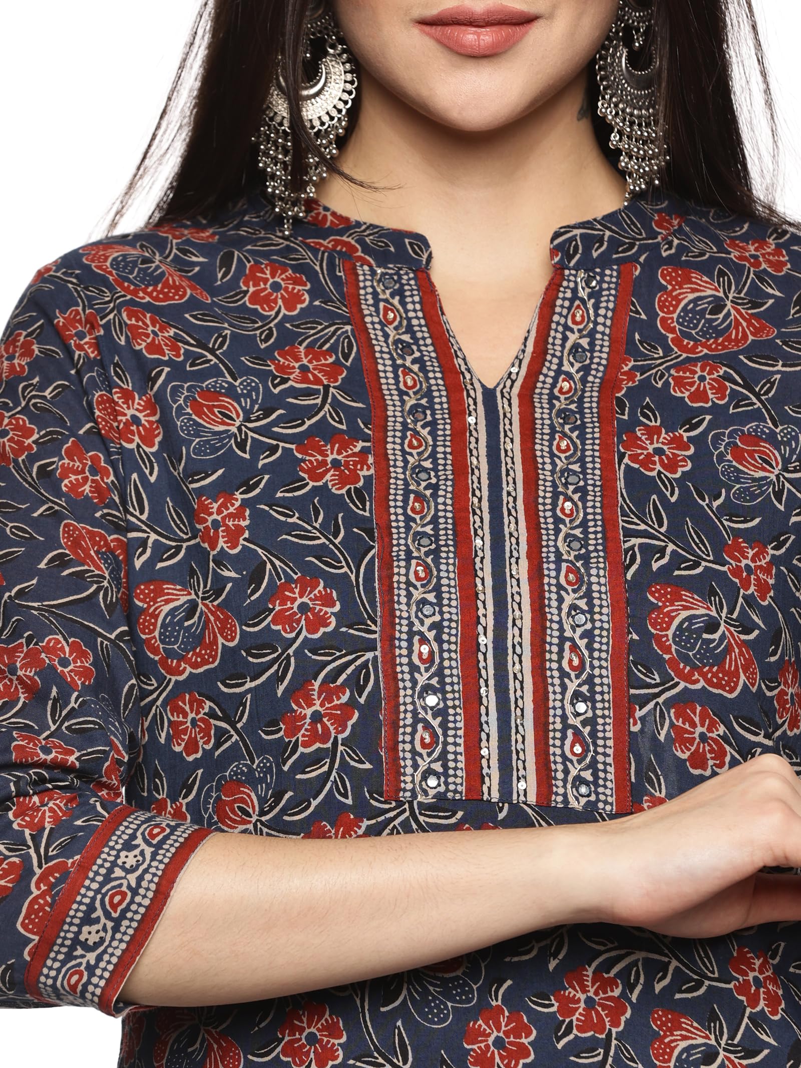 RAJMANDIRFABRICS Women’s Cotton Hand Work & Floral Printed Straight Kurta Set (PK10112074_XL_Navy Blue & Red_X_Large)