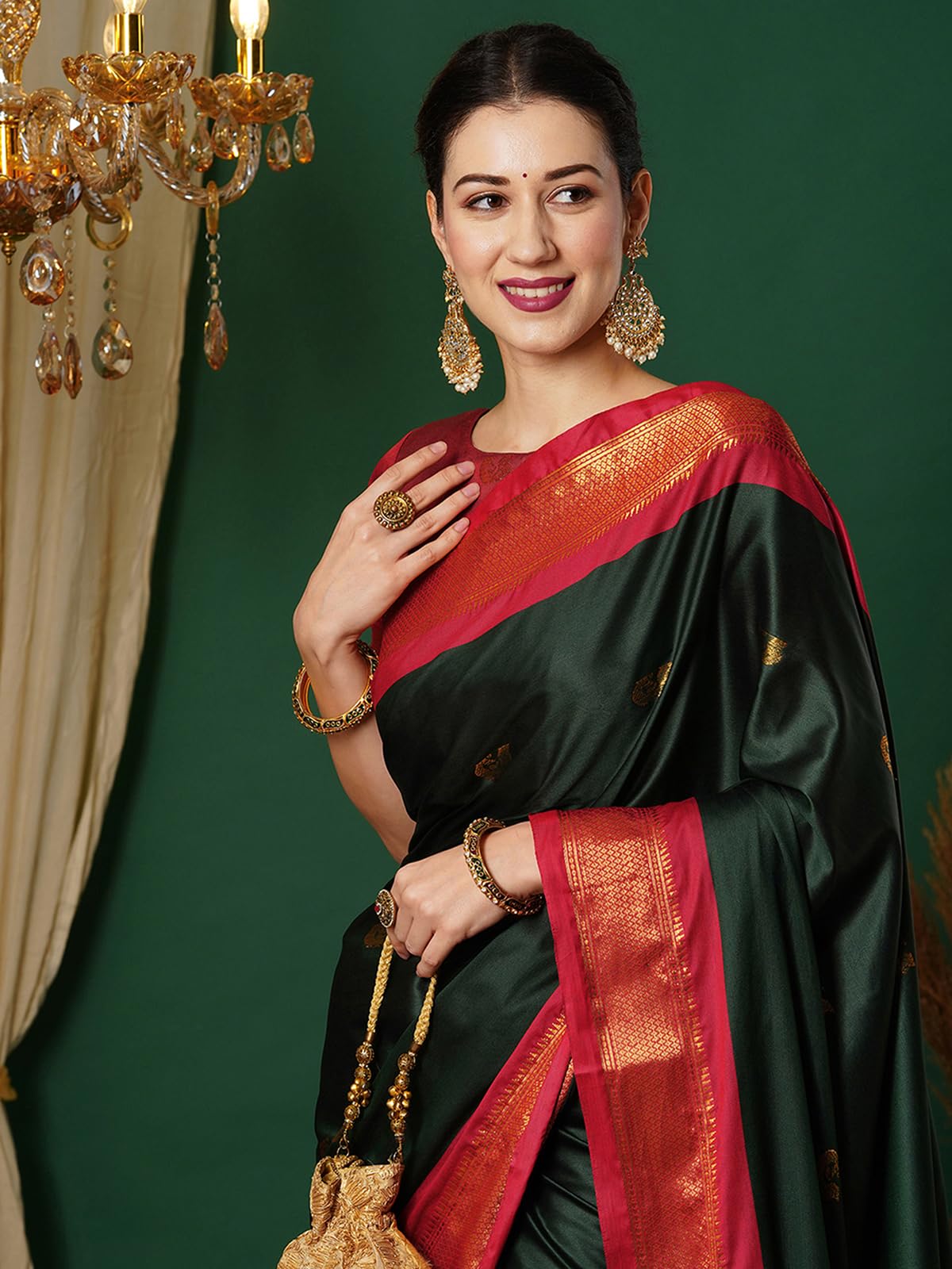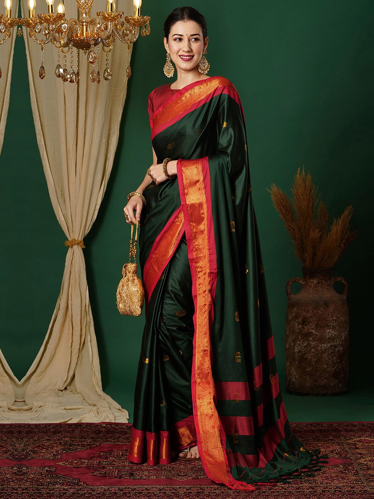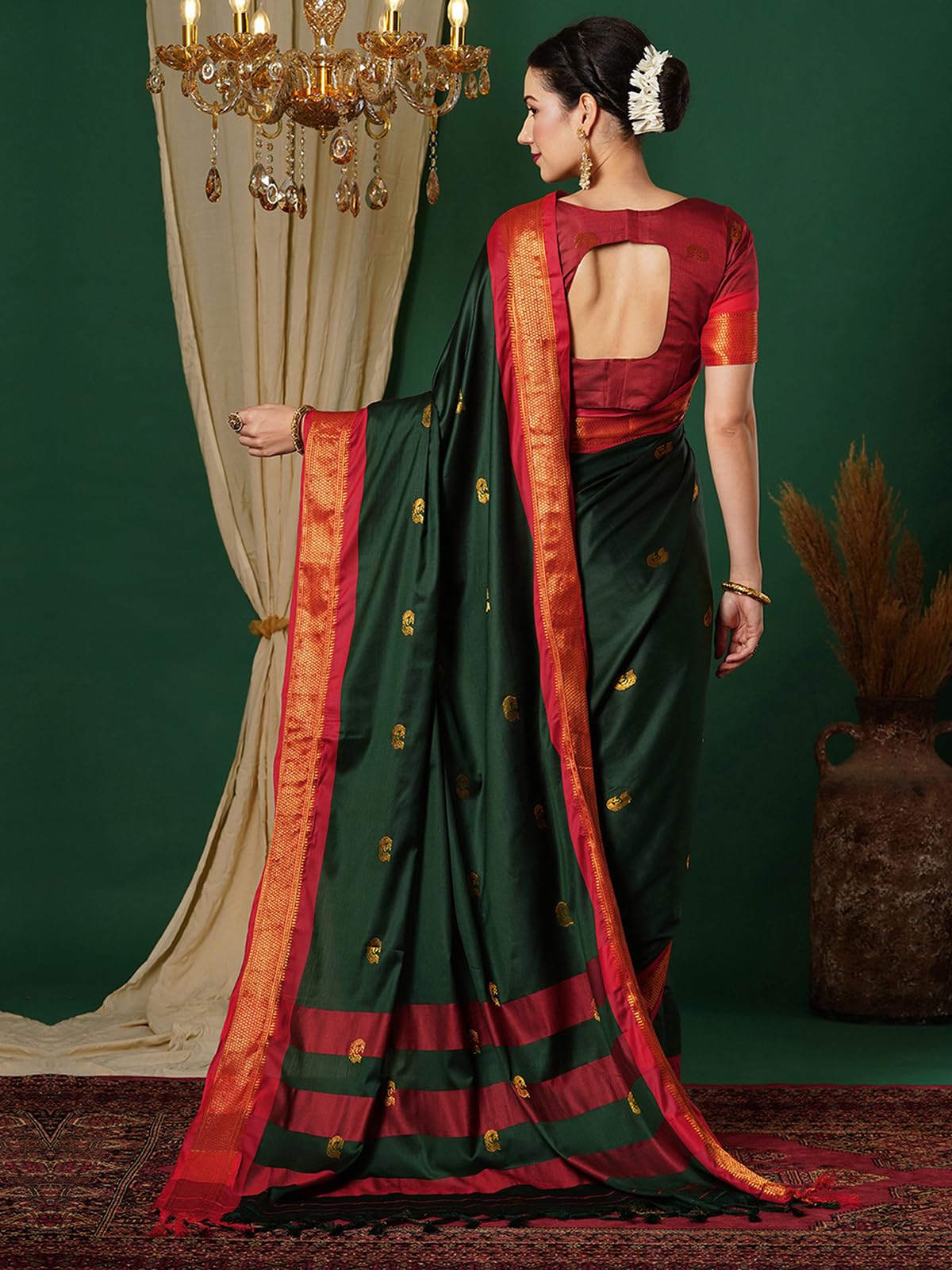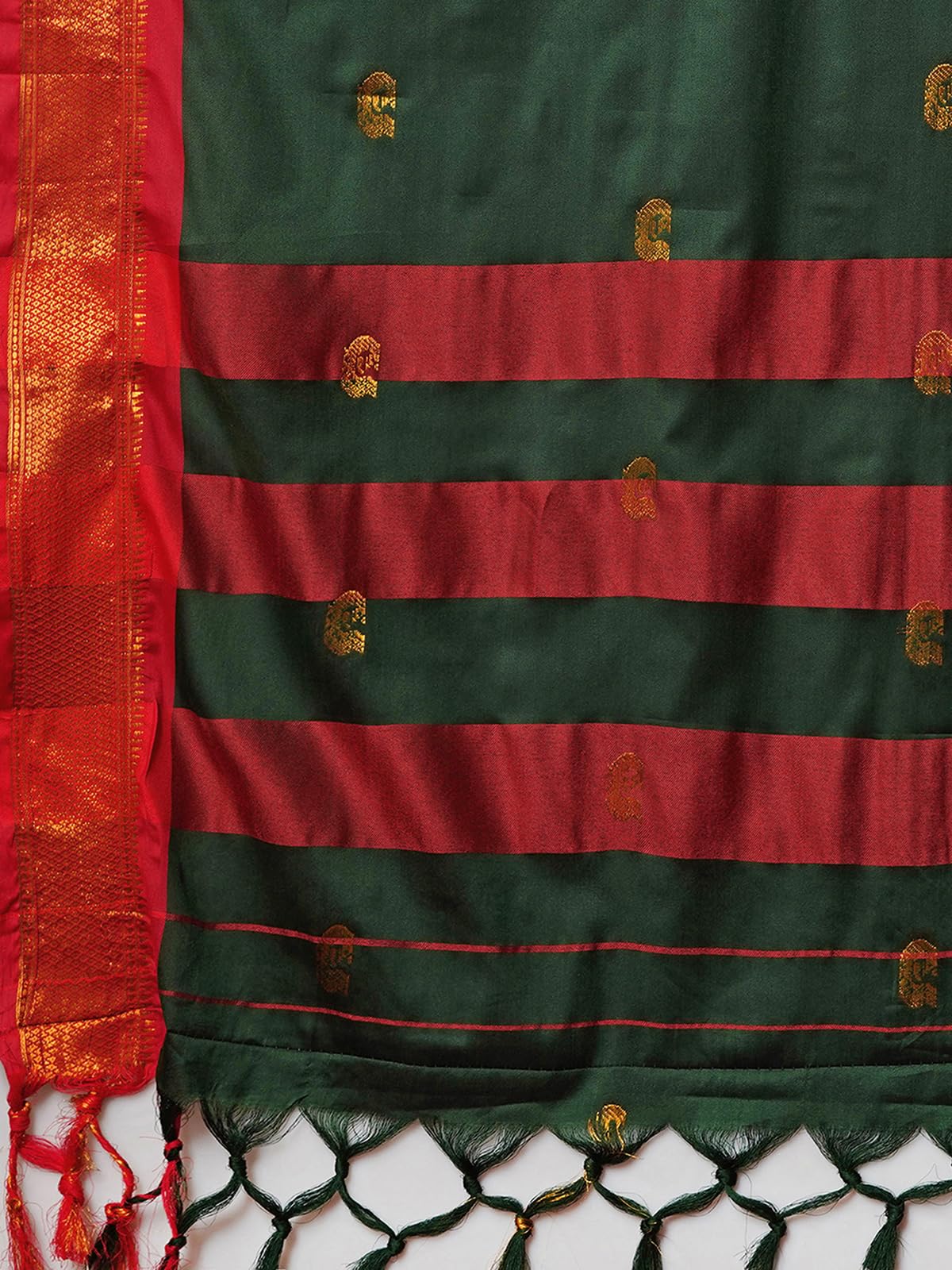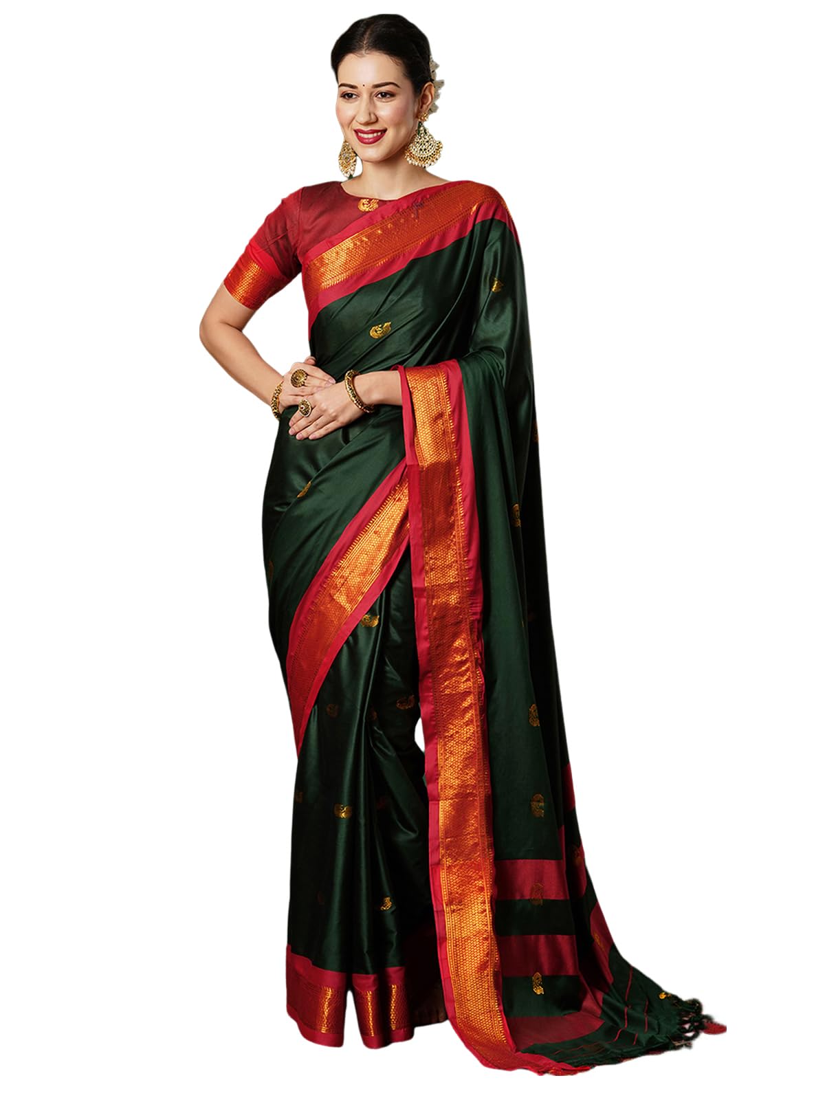 - Color :: Saree Color : Dark Green & Red || Blouse Color : Maroon || Disclaimer : Colour Of The Actual Product May Slightly Vary Due To Different Photographic Lighting Sources Or Your Display Color Settings Or Screen Type.