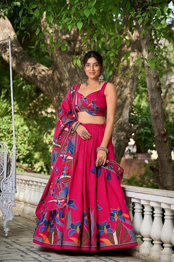 shree crialion Women’s Trending Designeer Tussar Silk Lehenga Choli Print with Foil Work With Unstitched Blouse Patola Print Adorned with Foil Work For Navrati || Wedding (1216 PINK)