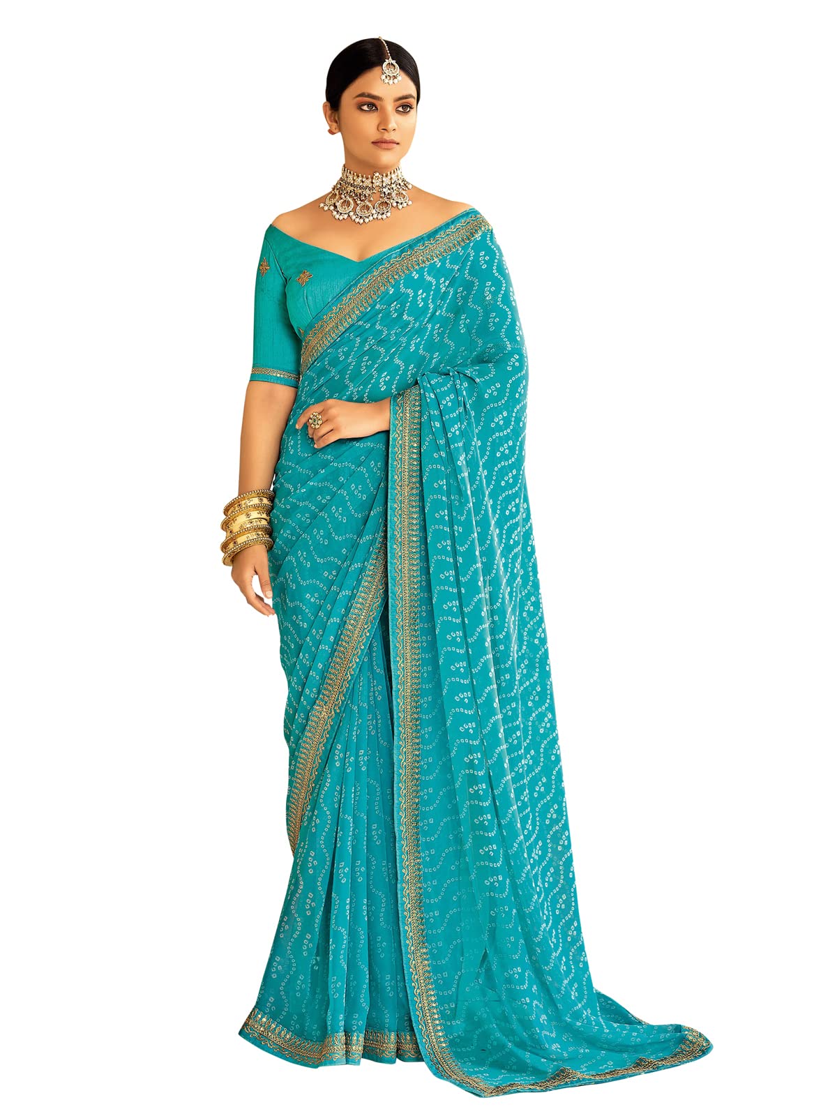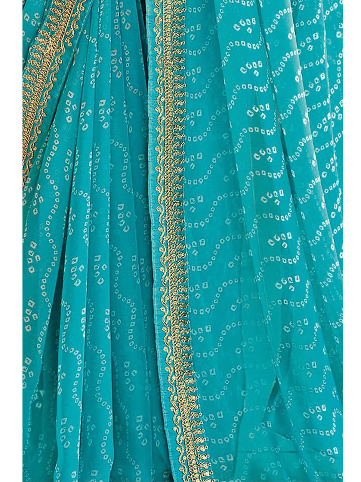 SIRIL Women’s Bandhani Printed & Embroidery Work In Lace Georgette Saree with Unstitched Blouse Piece(2302S128_Sky Blue, White)