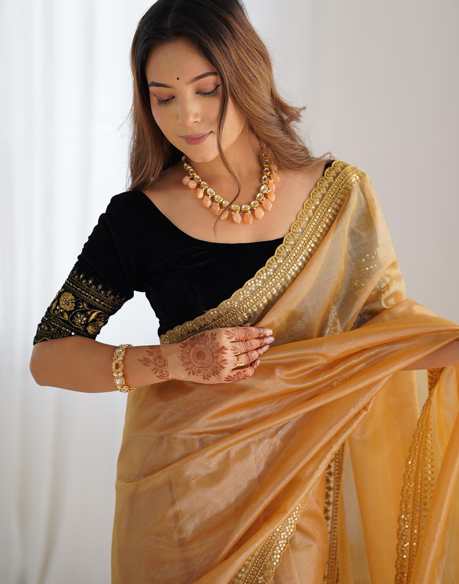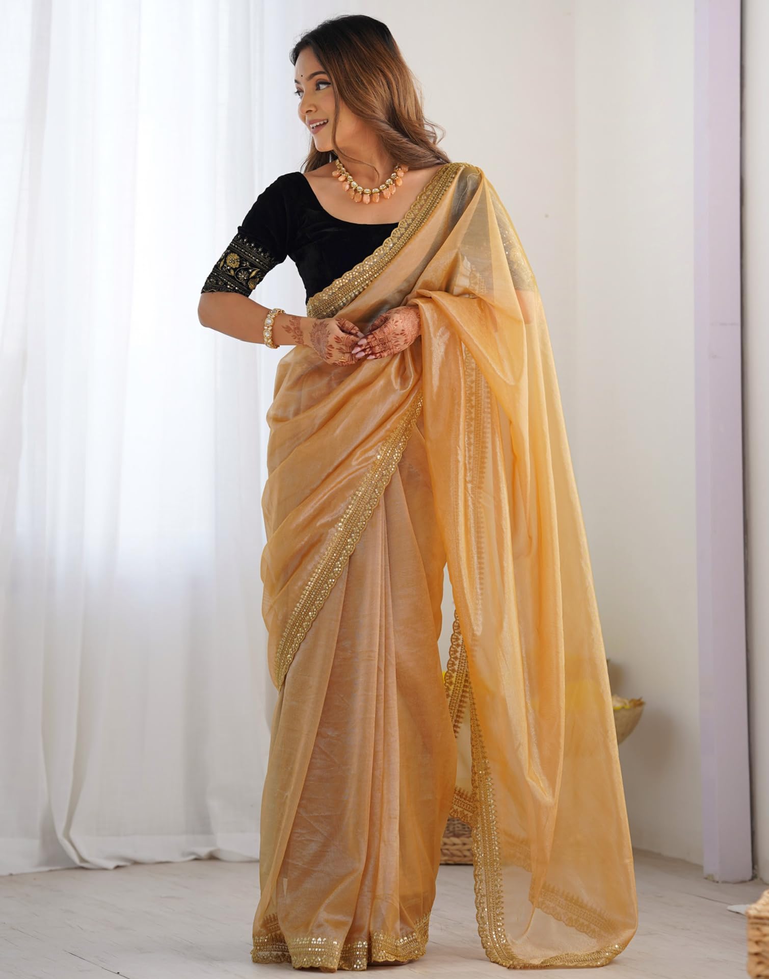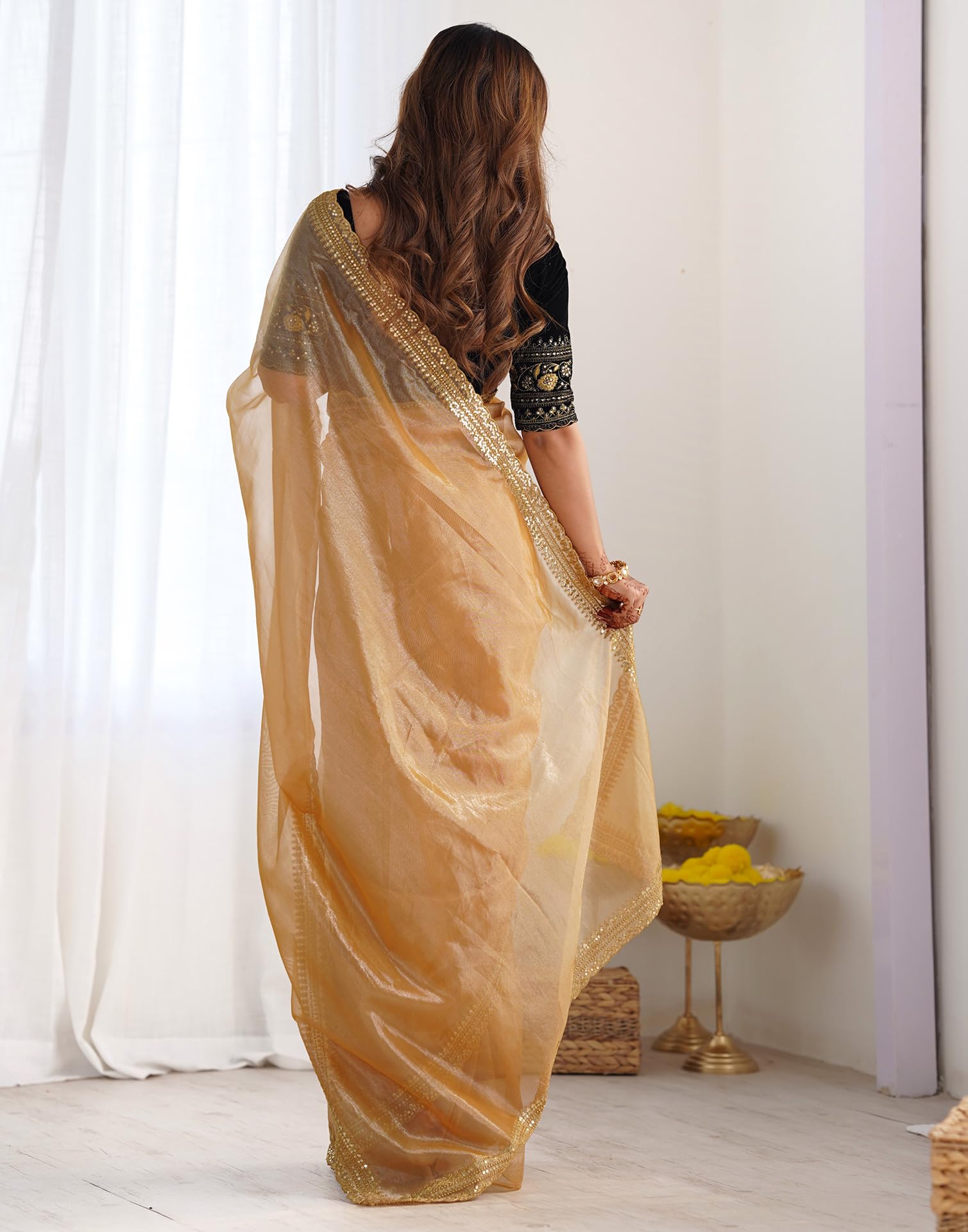 SIRIL Women’s Shimmer Net Sequence Embroidery Saree Lace with Unstitched blouse Piece (3997S131AA_Light Brown)