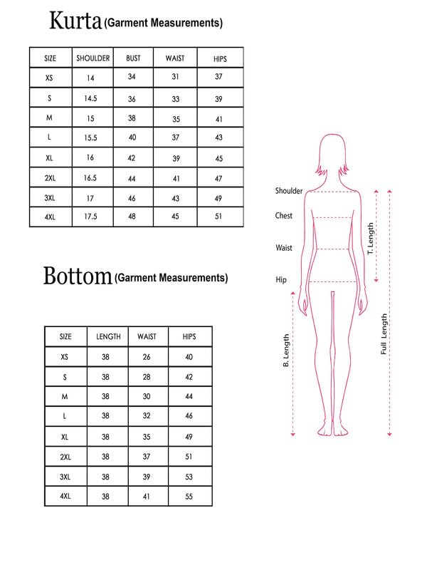 • Size Details : Bust- 36, Kurta Waist- 33, Hip- 39, Bottom Waist- 28. (All Measurements are in Inches)