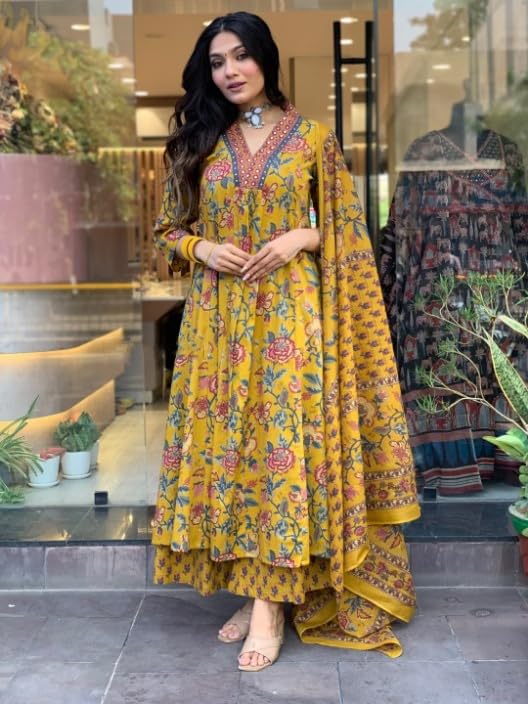 Yashika Women’s Regular Cotton Blend Floral Printed Kurta Plazzo Set with Dupatta Suitable for Every Indian Occasion (AZ-YS-OG-KS2171-Parent_Yellow